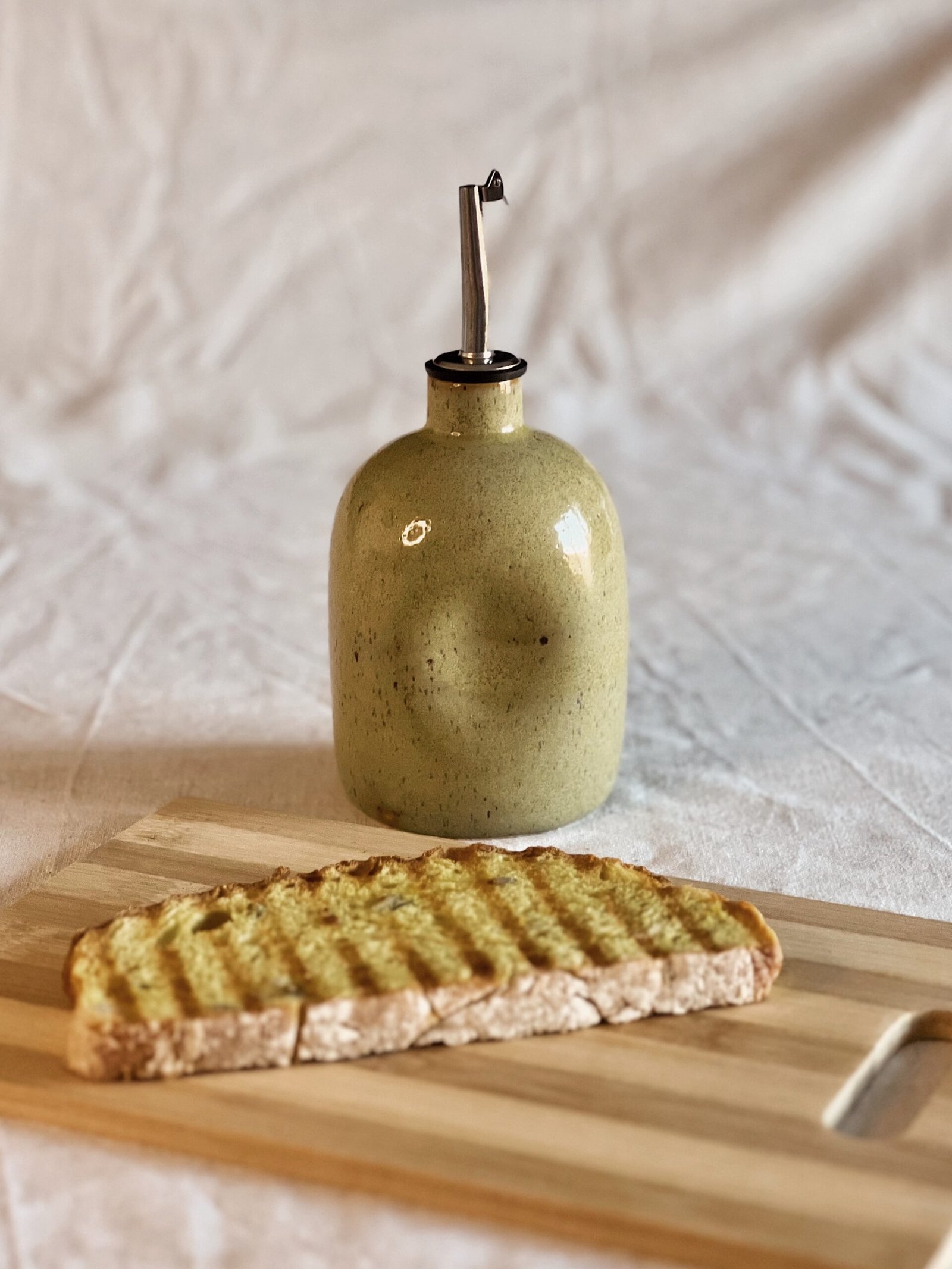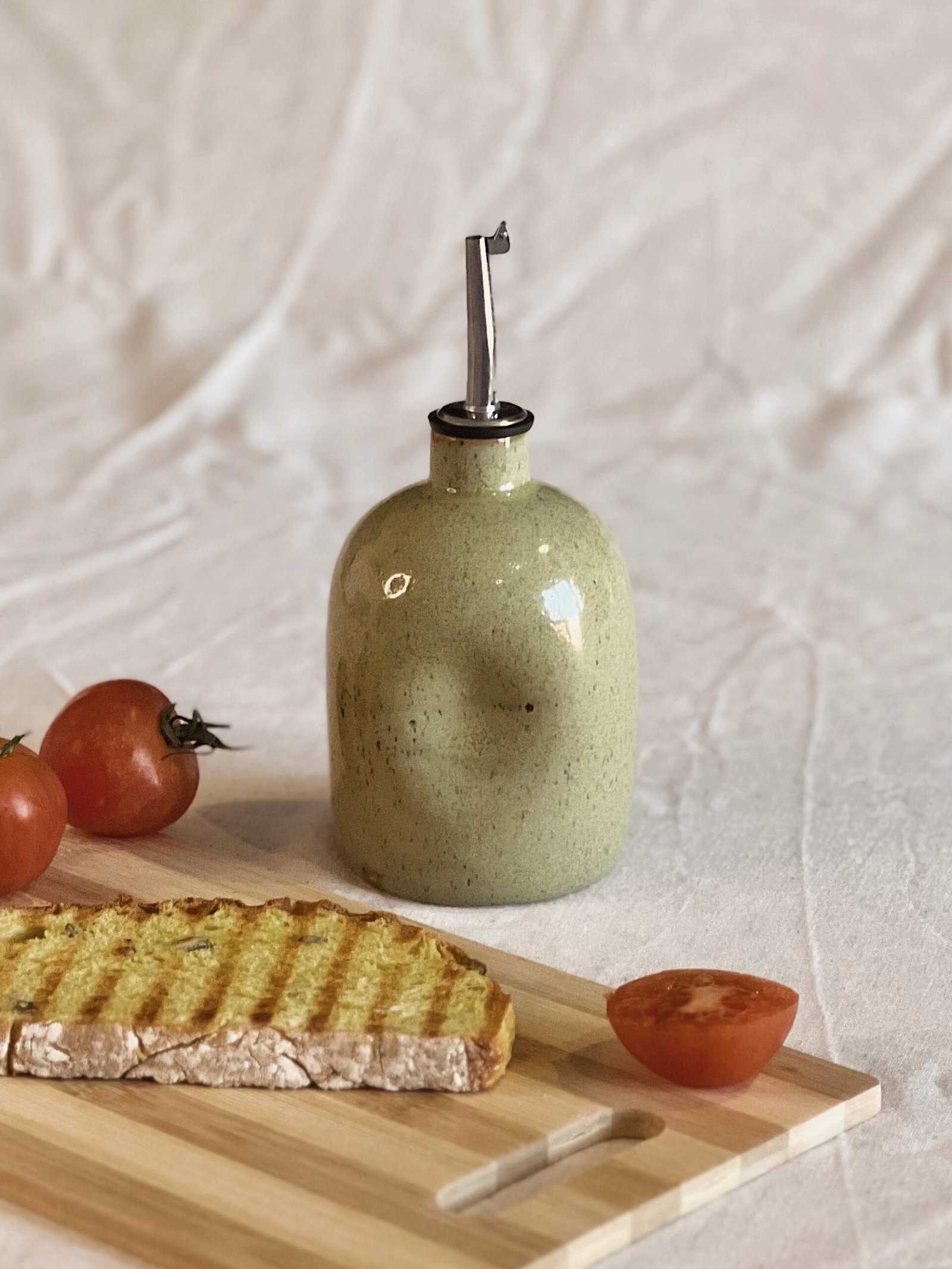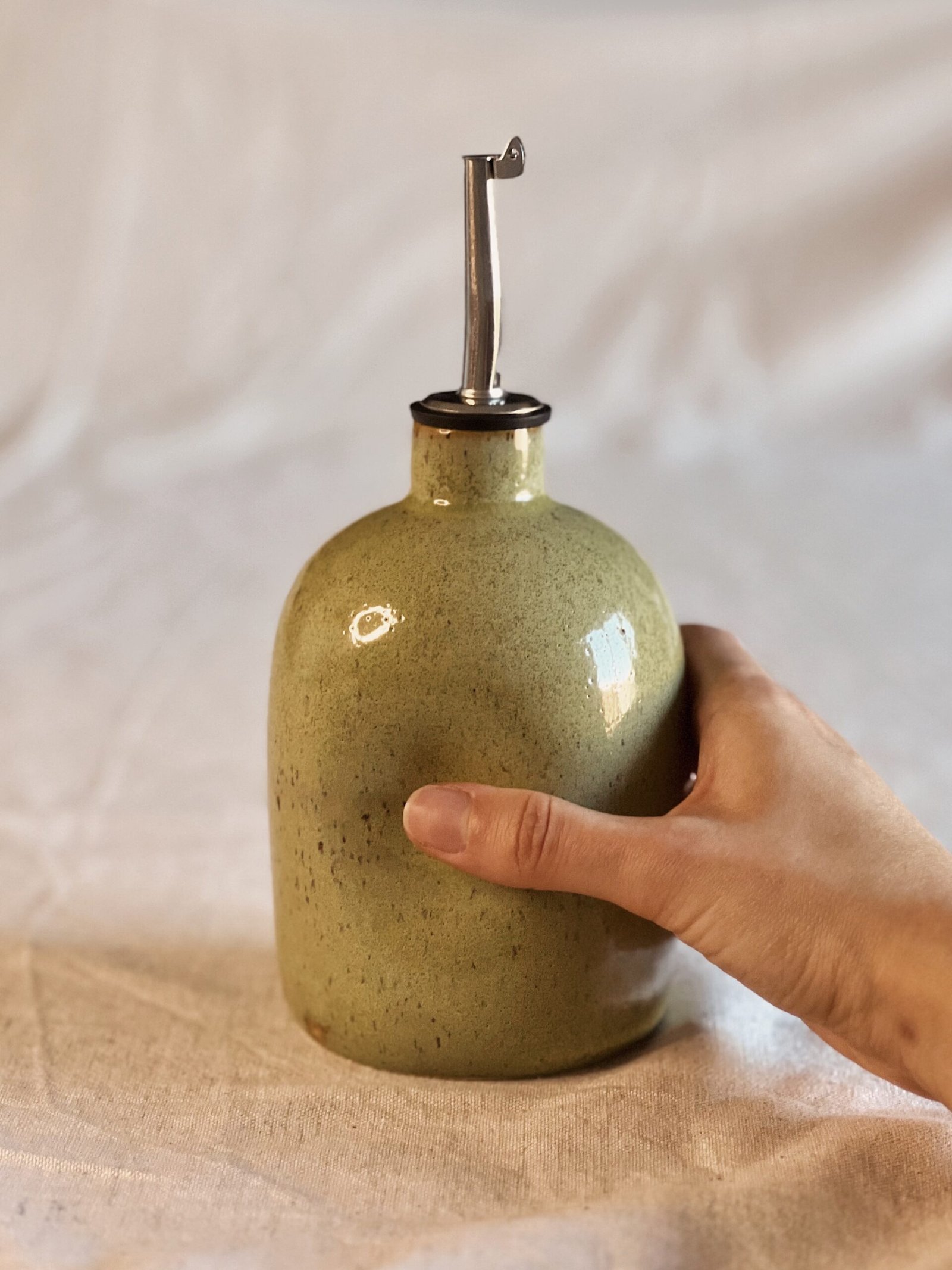 Esta aceitera está hecha de forma artesanal en torno alfarero con gres moteado de alta temperatura y esmaltado en verde jaspe.