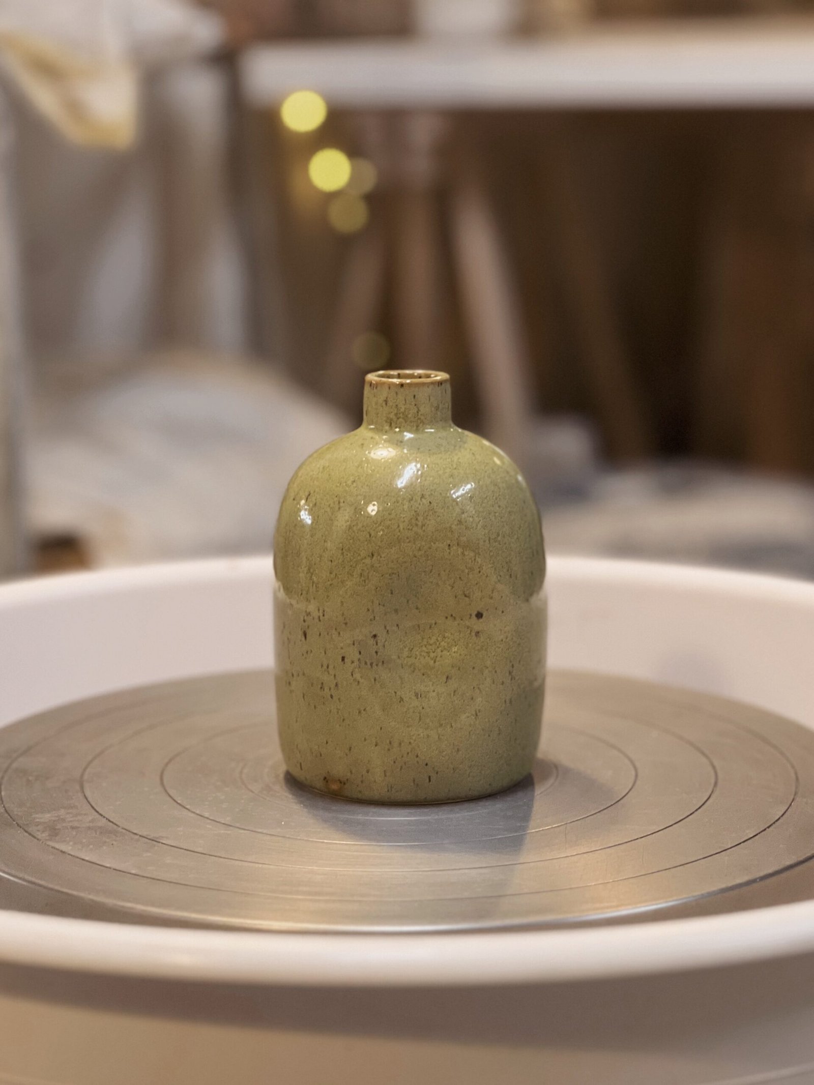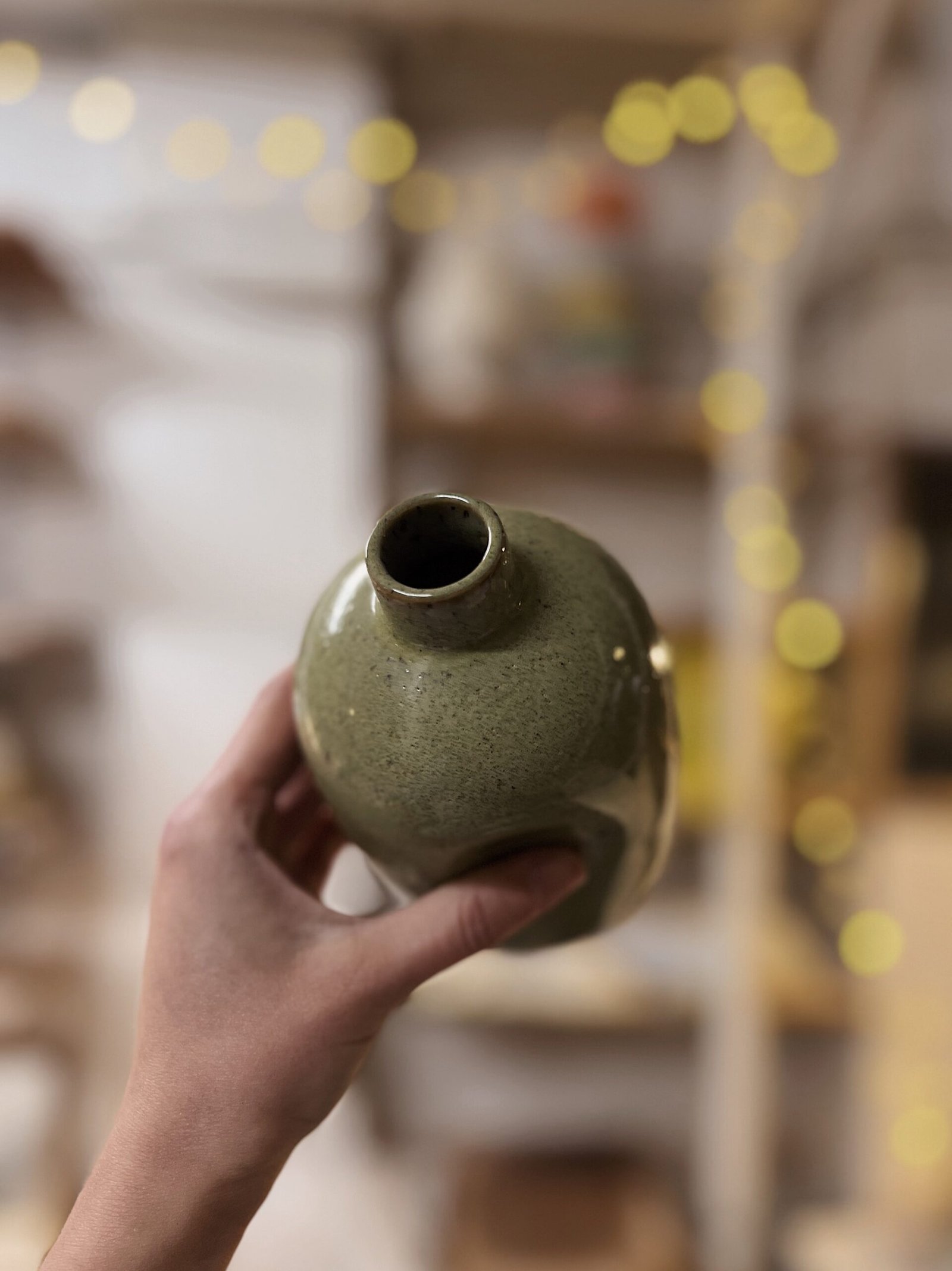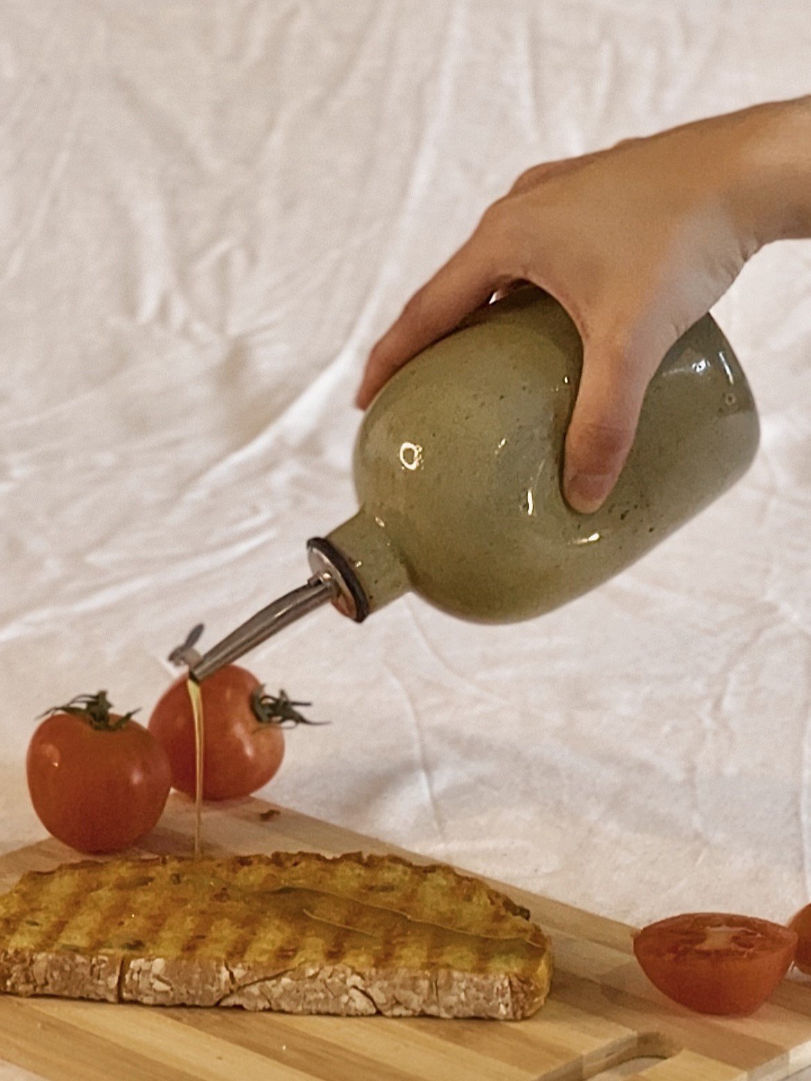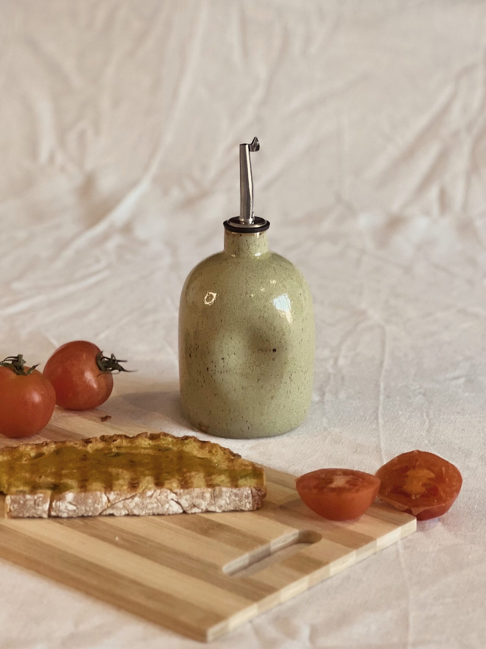Esta aceitera está hecha de forma artesanal en torno alfarero con gres moteado de alta temperatura y esmaltado en verde jaspe.