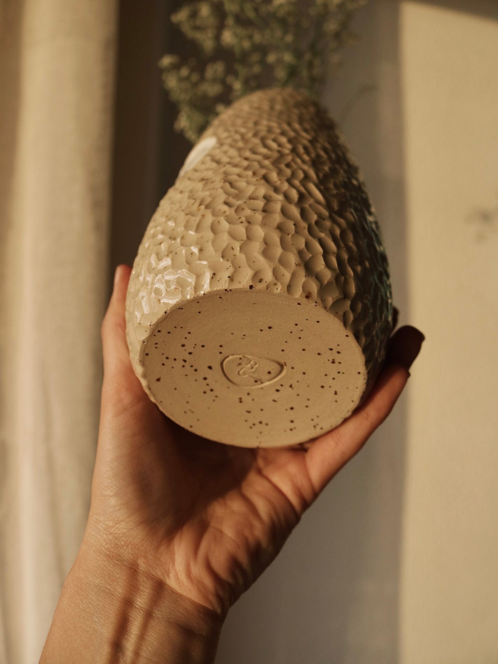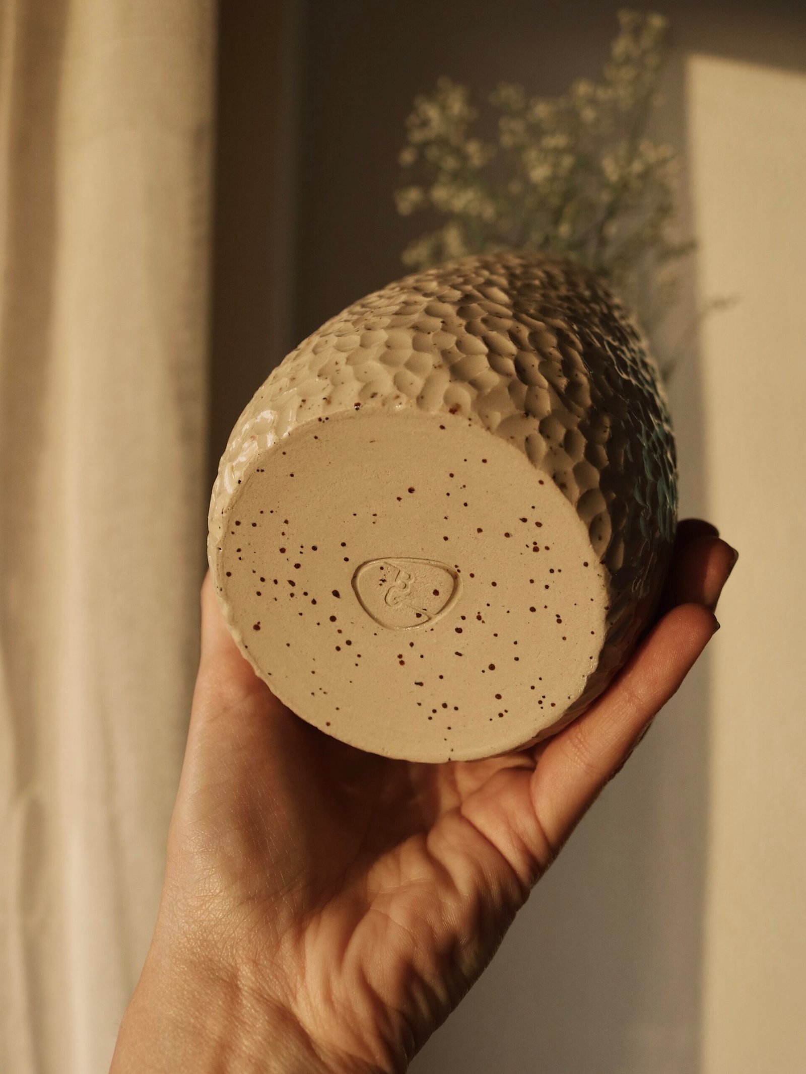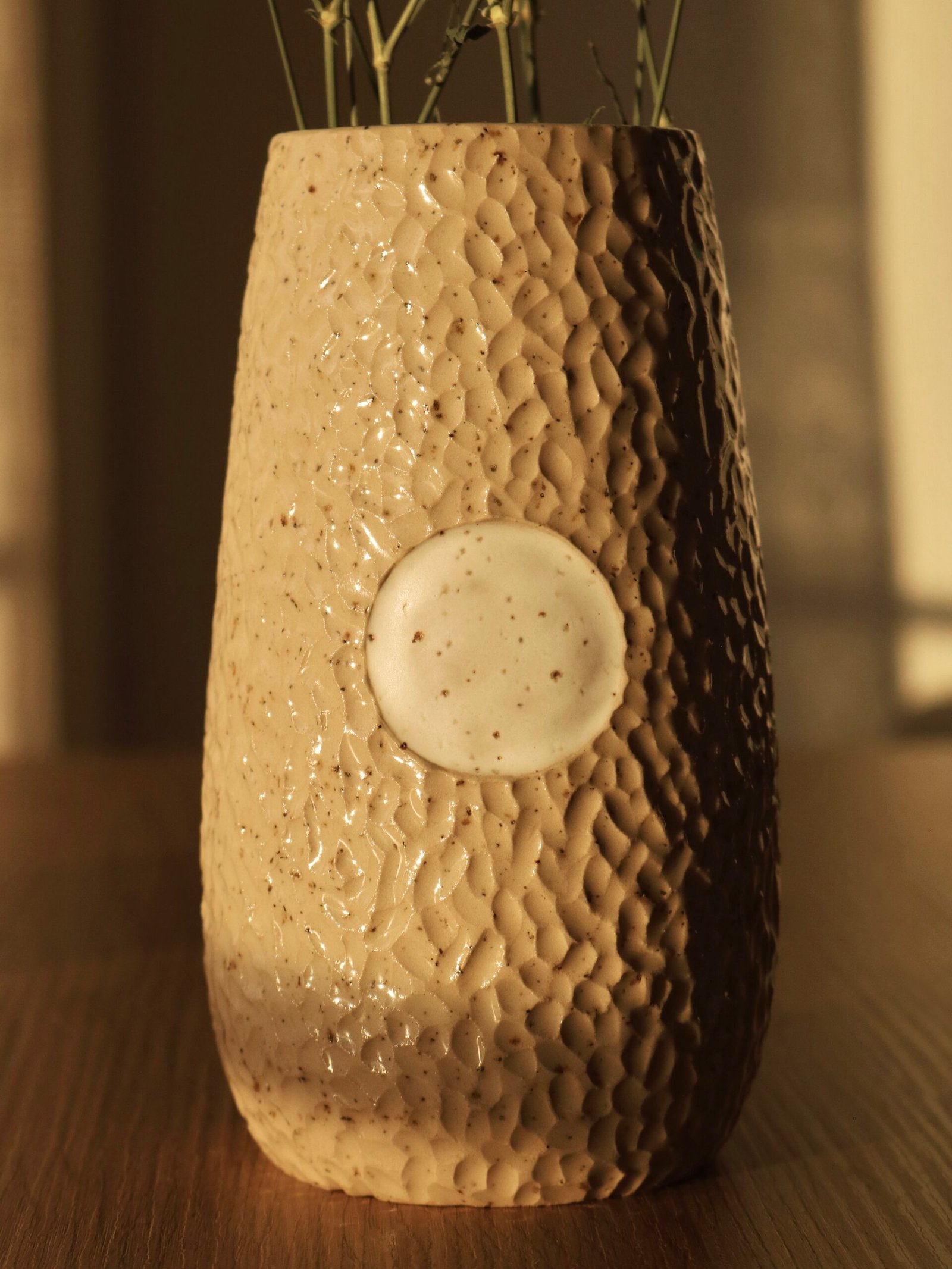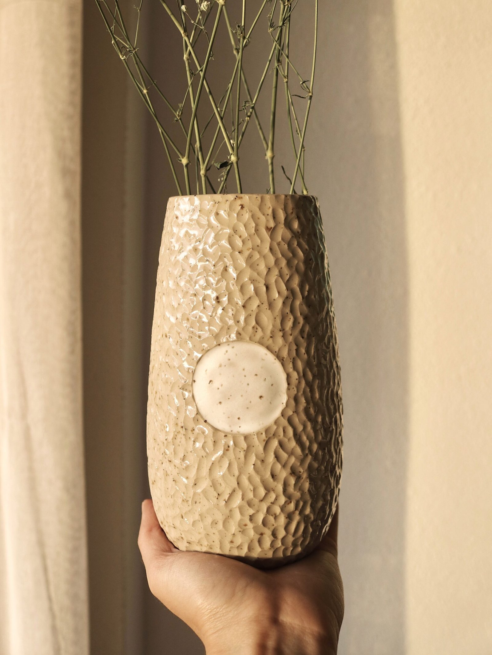 Este jarrón está hecho de forma artesanal en torno alfarero con barro moteado de alta temperatura. Textura irregular en la superficie y un círculo blanco en el centro simboliza la calma dentro del caos.