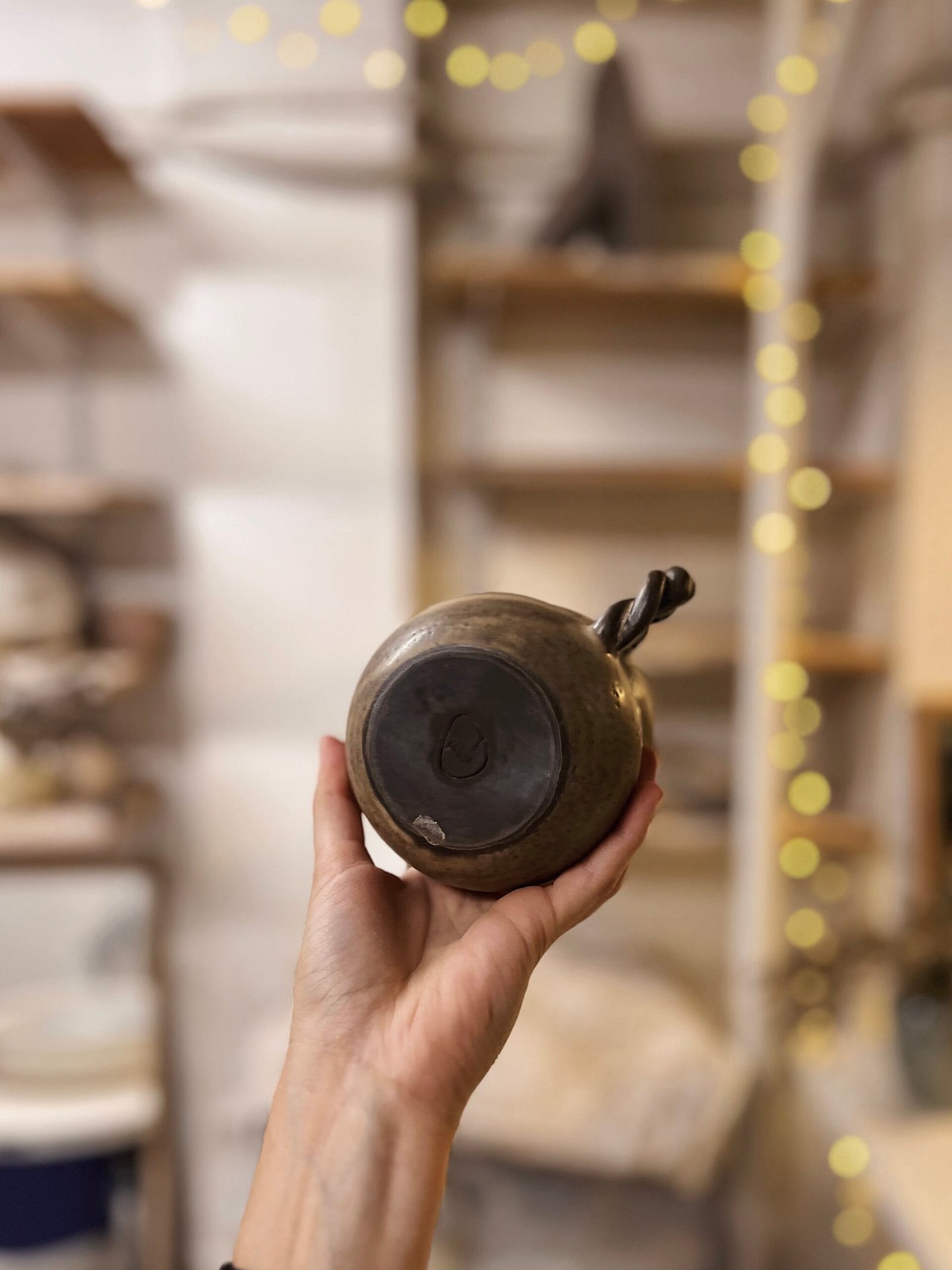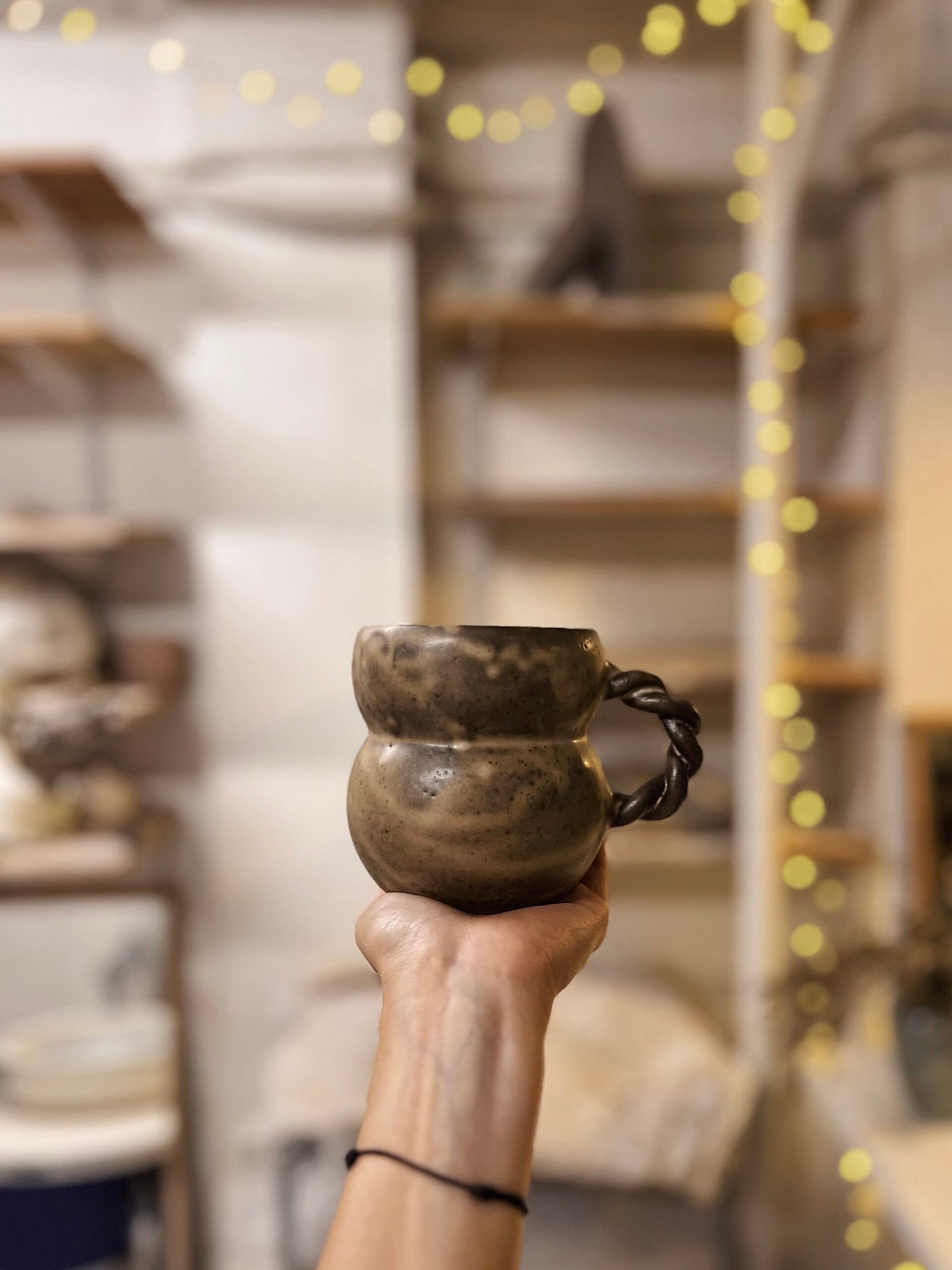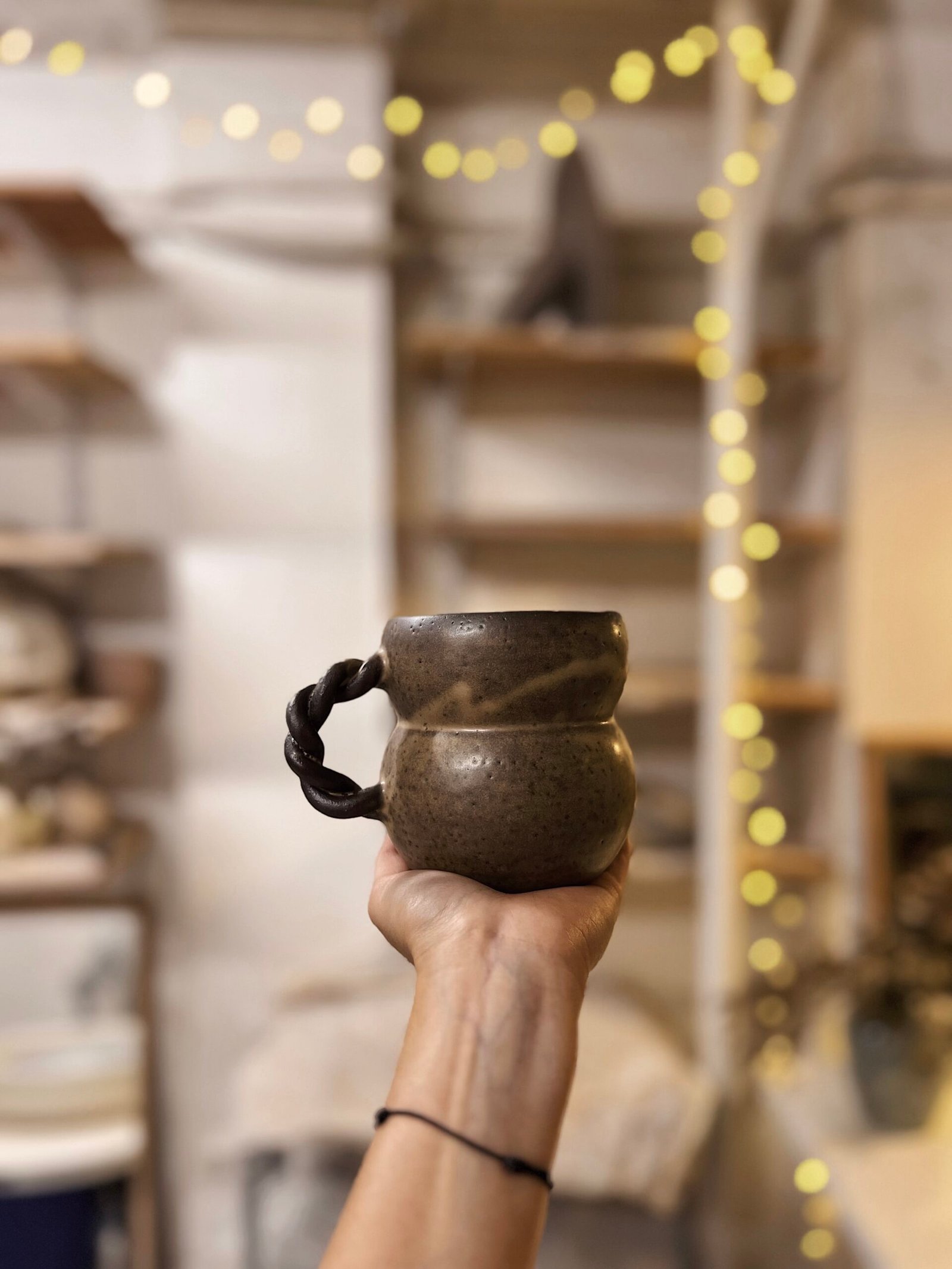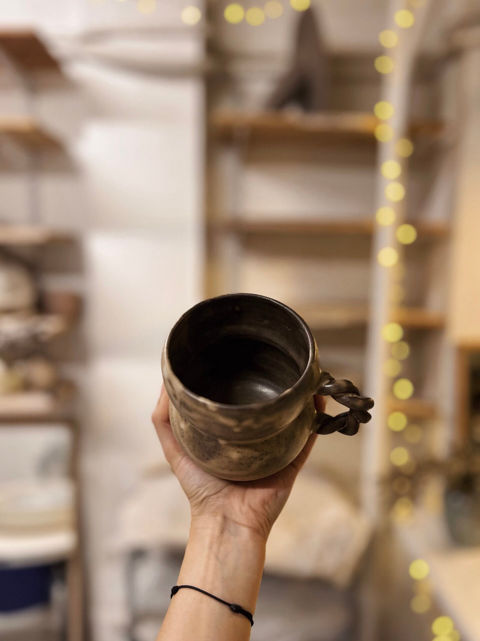 Esta taza está hecha con gres negro de alta temperatura en torno alfarero y esmaltada en color blanco mate.