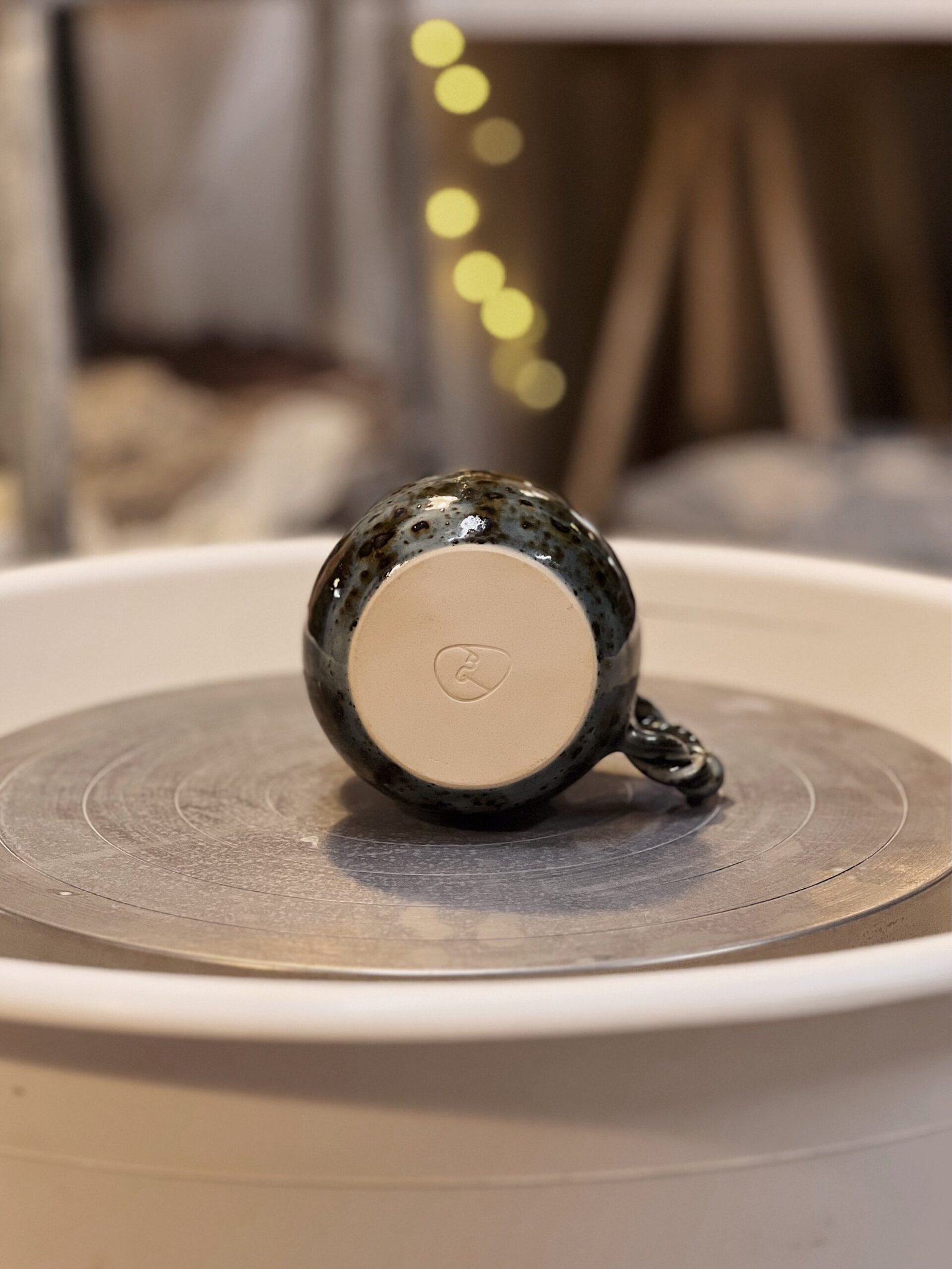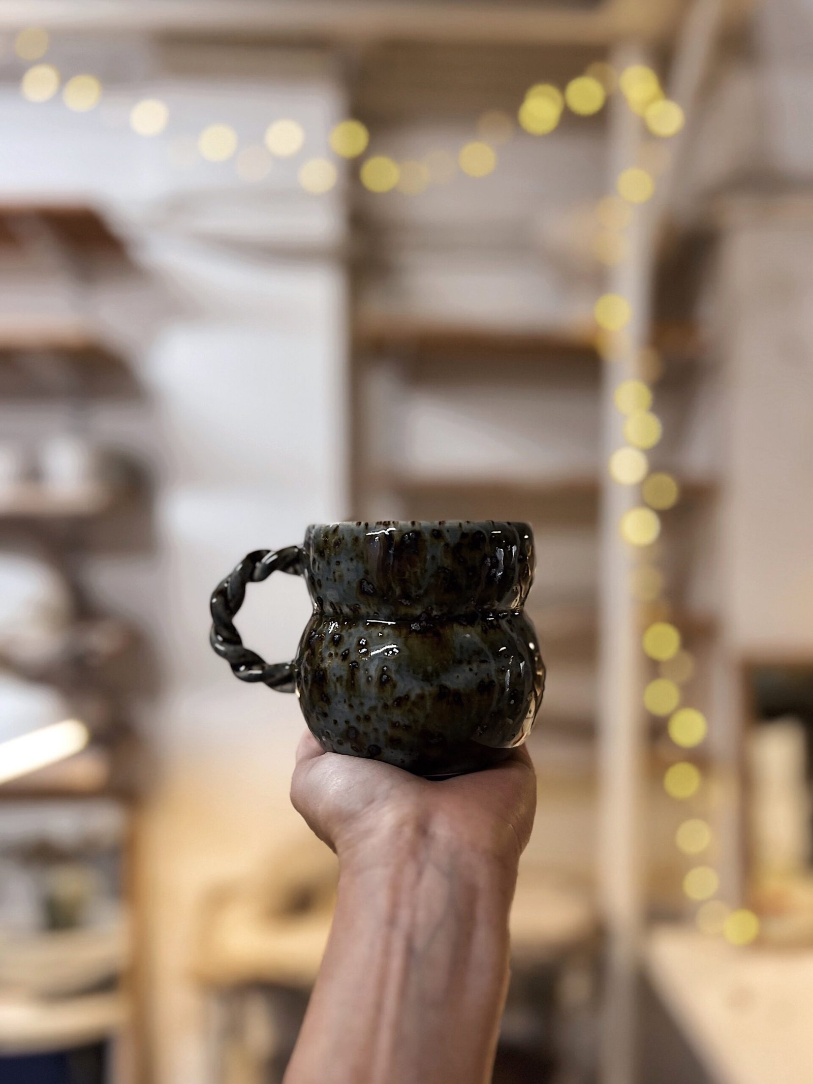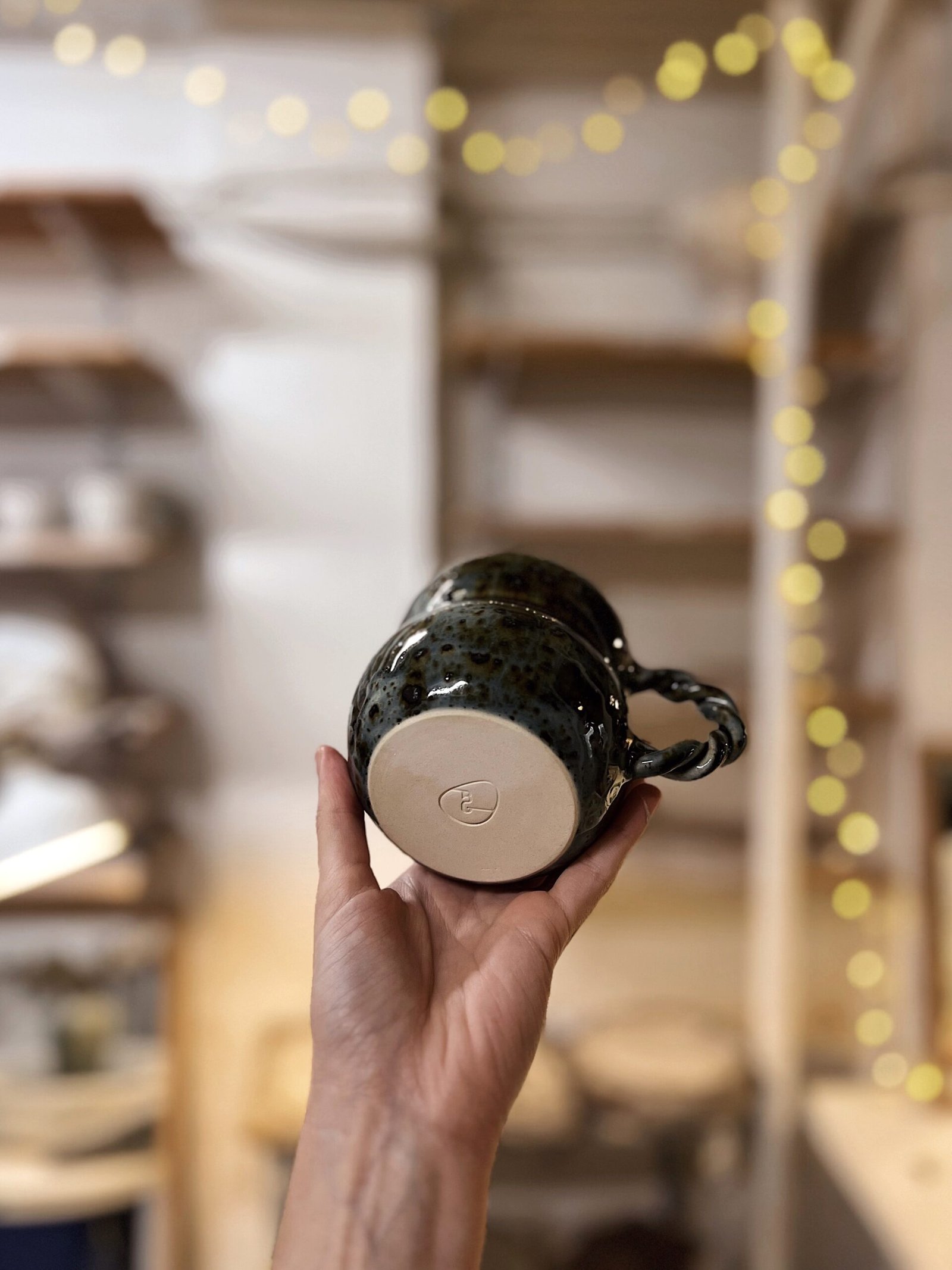 Esta pieza está hecha a torno con gres blanco y esmaltada con un color azul oscuro moteado. Esta pieza destaca por su asa trenzada que le aporta un toque único y especial.