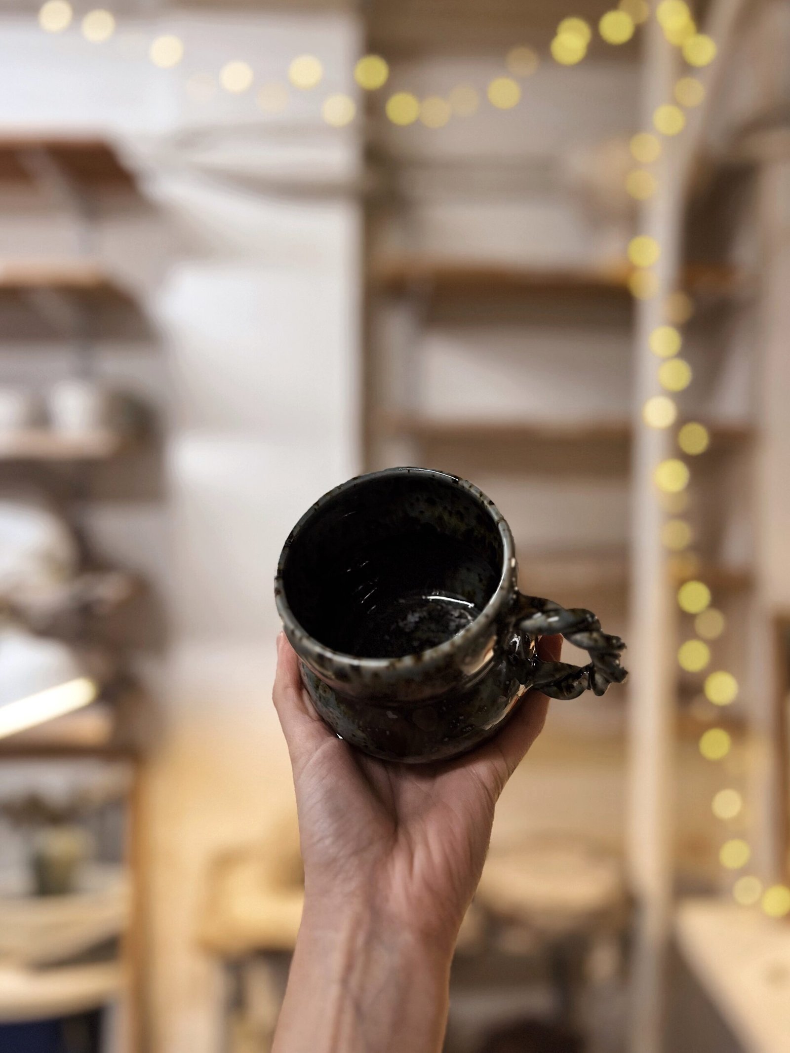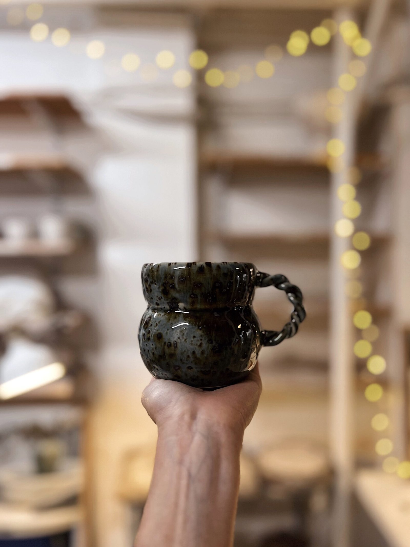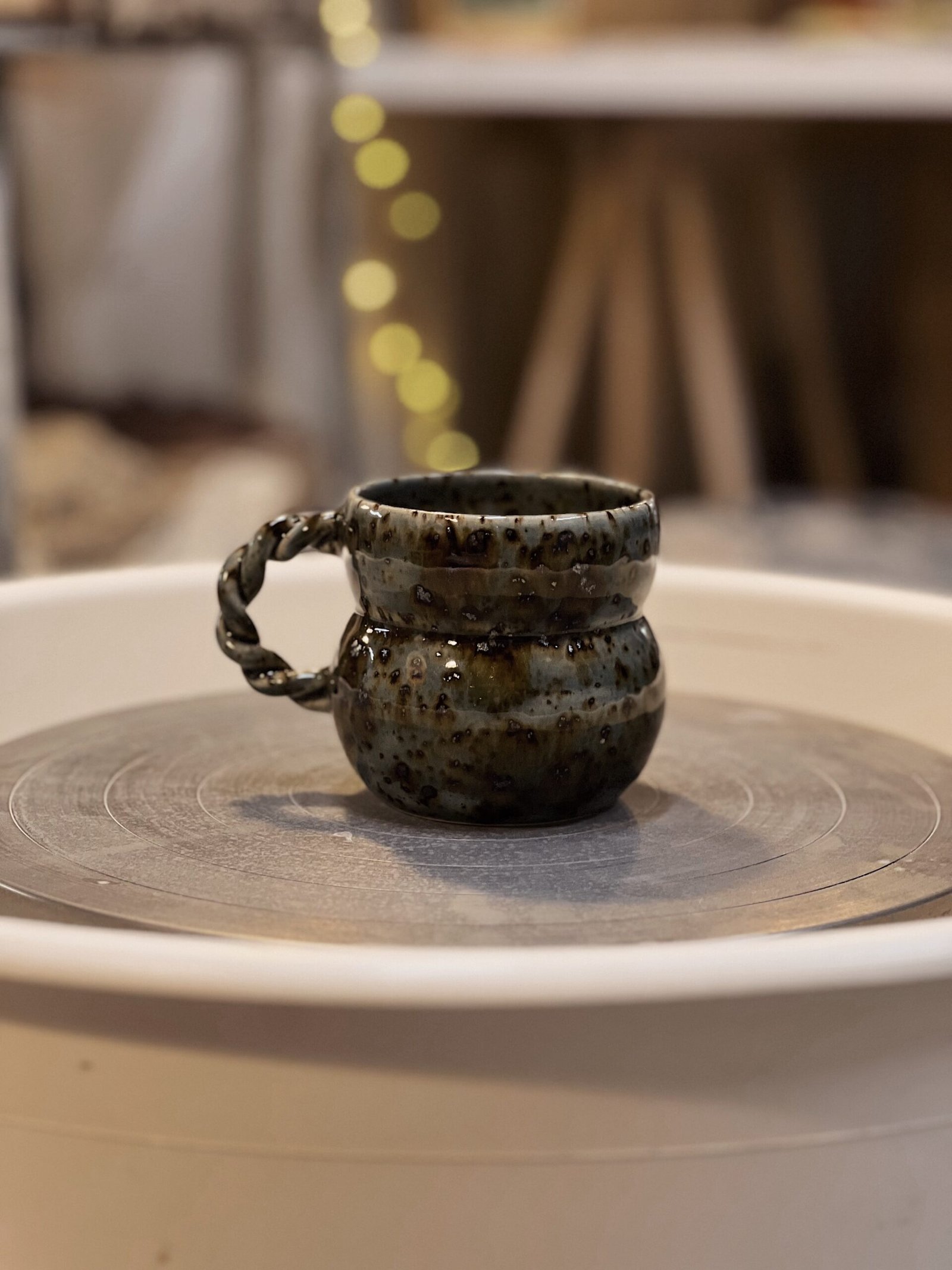 Esta pieza está hecha a torno con gres blanco y esmaltada con un color azul oscuro moteado. Esta pieza destaca por su asa trenzada que le aporta un toque único y especial.