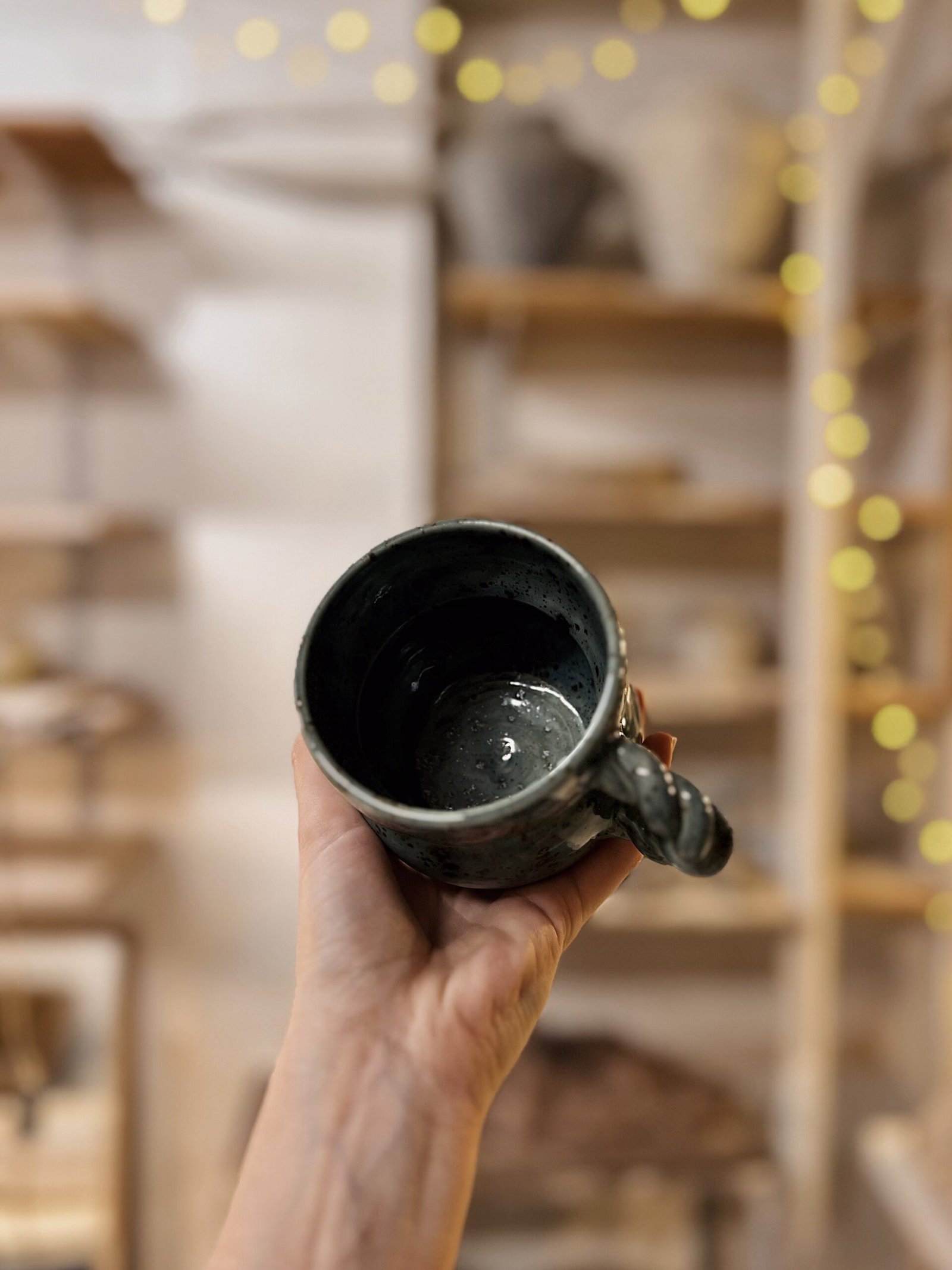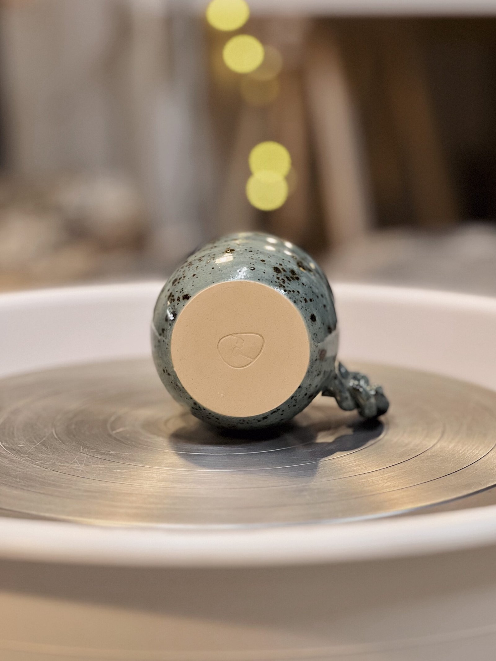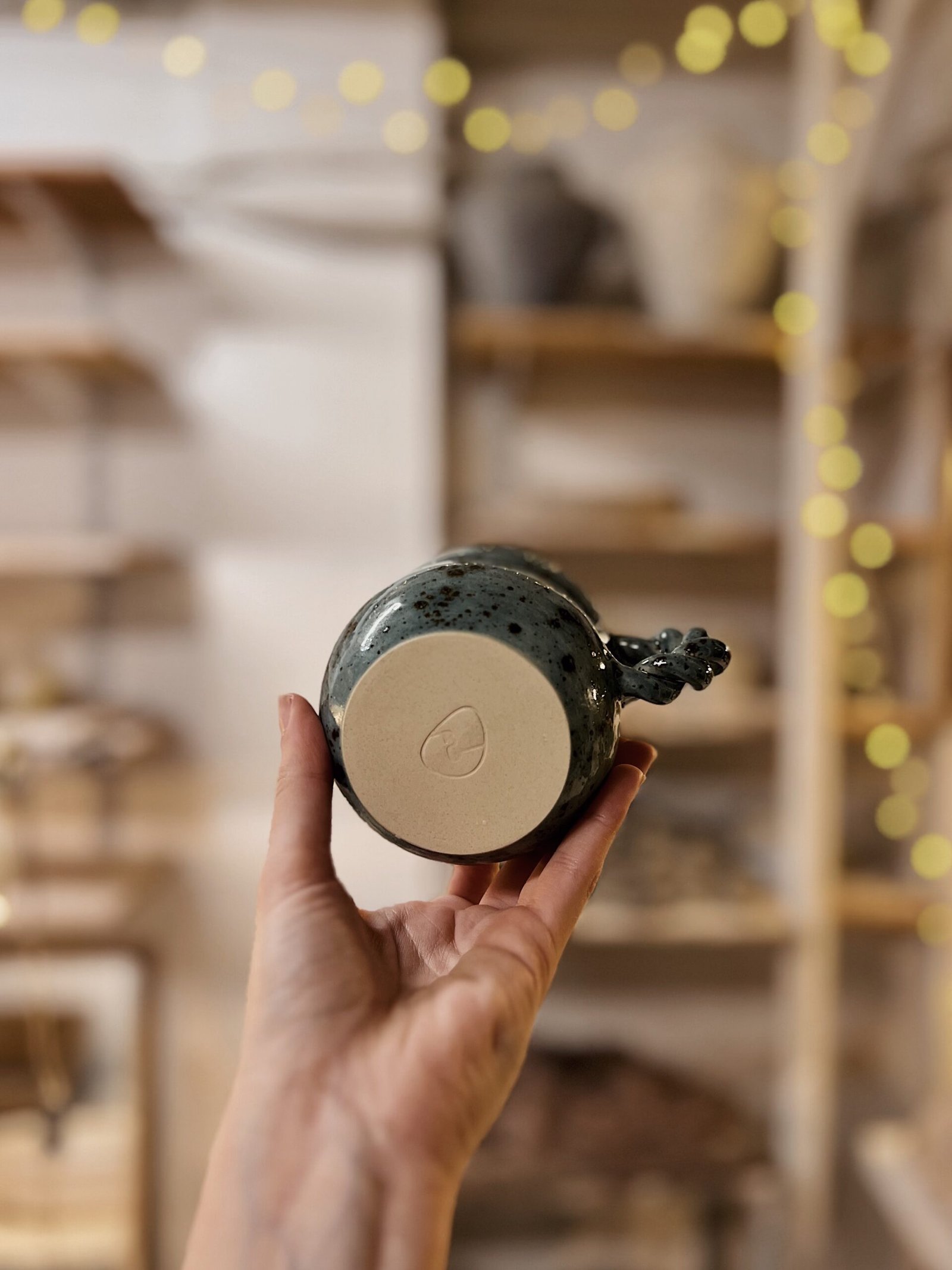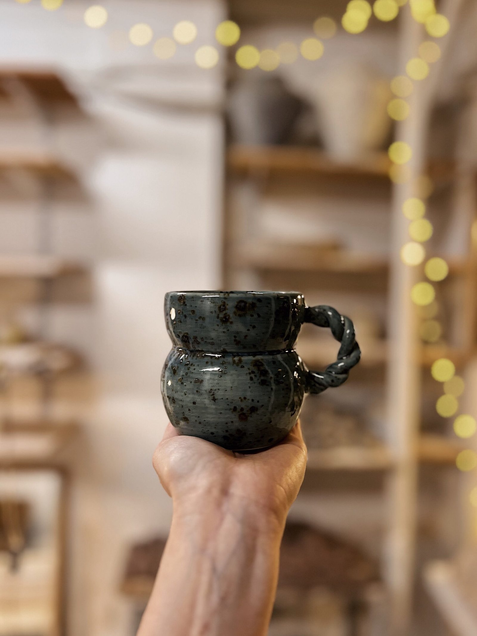Esta pieza está hecha a torno con gres blanco y esmaltada con un color azul oscuro moteado. Esta pieza destaca por su asa trenzada que le aporta un toque único y especial.
