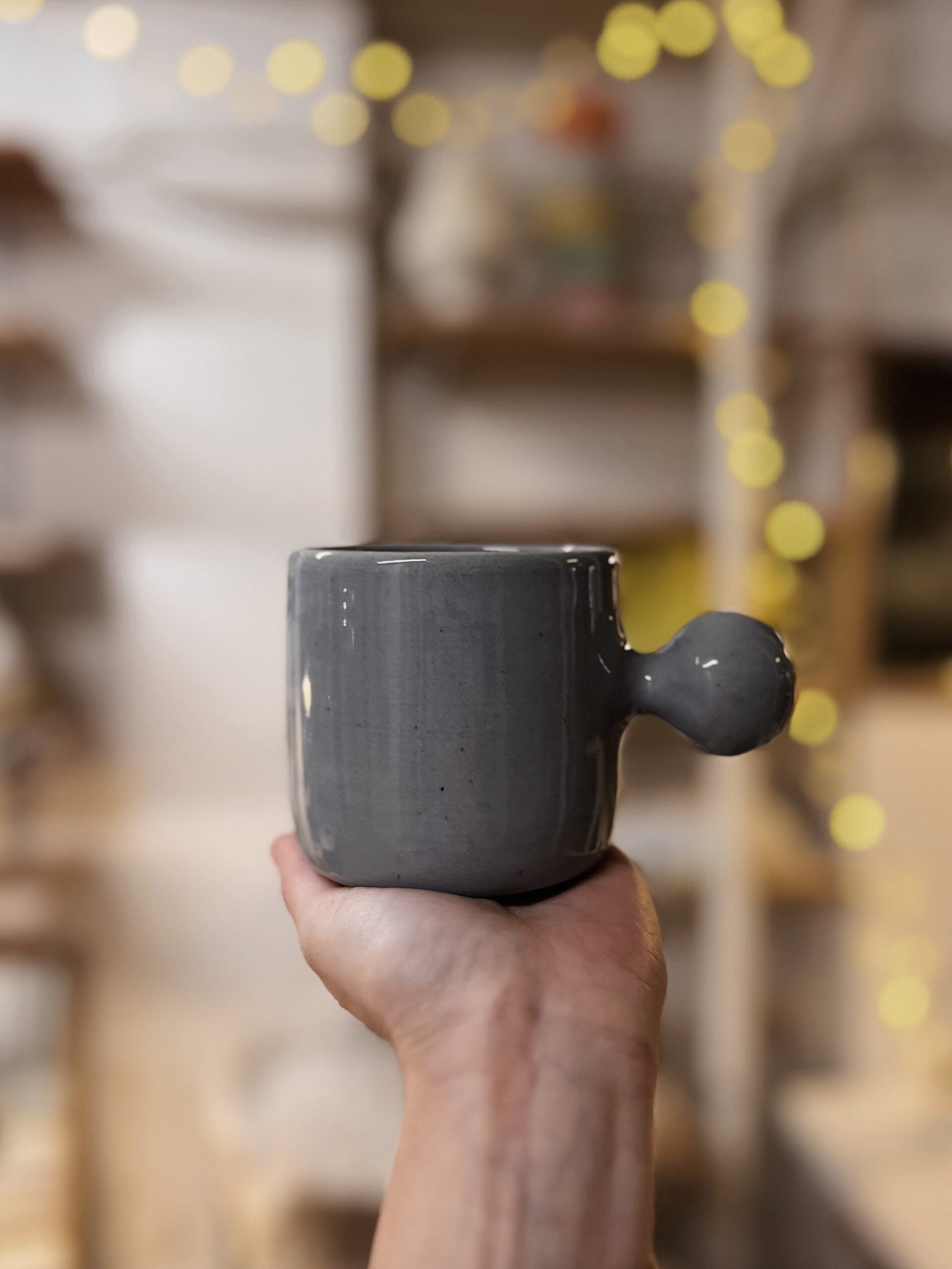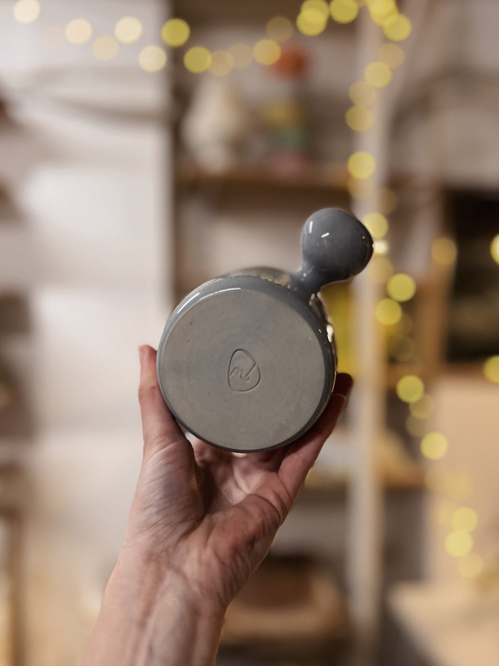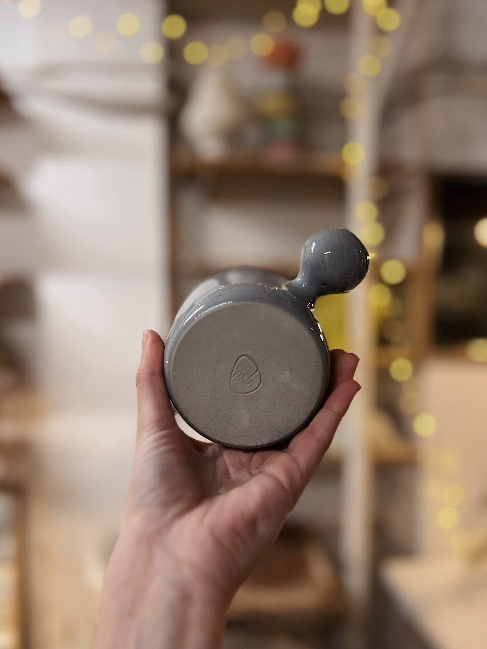 Esta taza está hecha a torno con gres de alta temperatura coloreada con cobalto y esmaltada en transparente. Es una pieza única, con un asa muy particular en forma de botón, que la hace especial. Pensada para que ésta no moleste y puedas abrazarla con las manos mientras te tomas tu bebida caliente favorita.