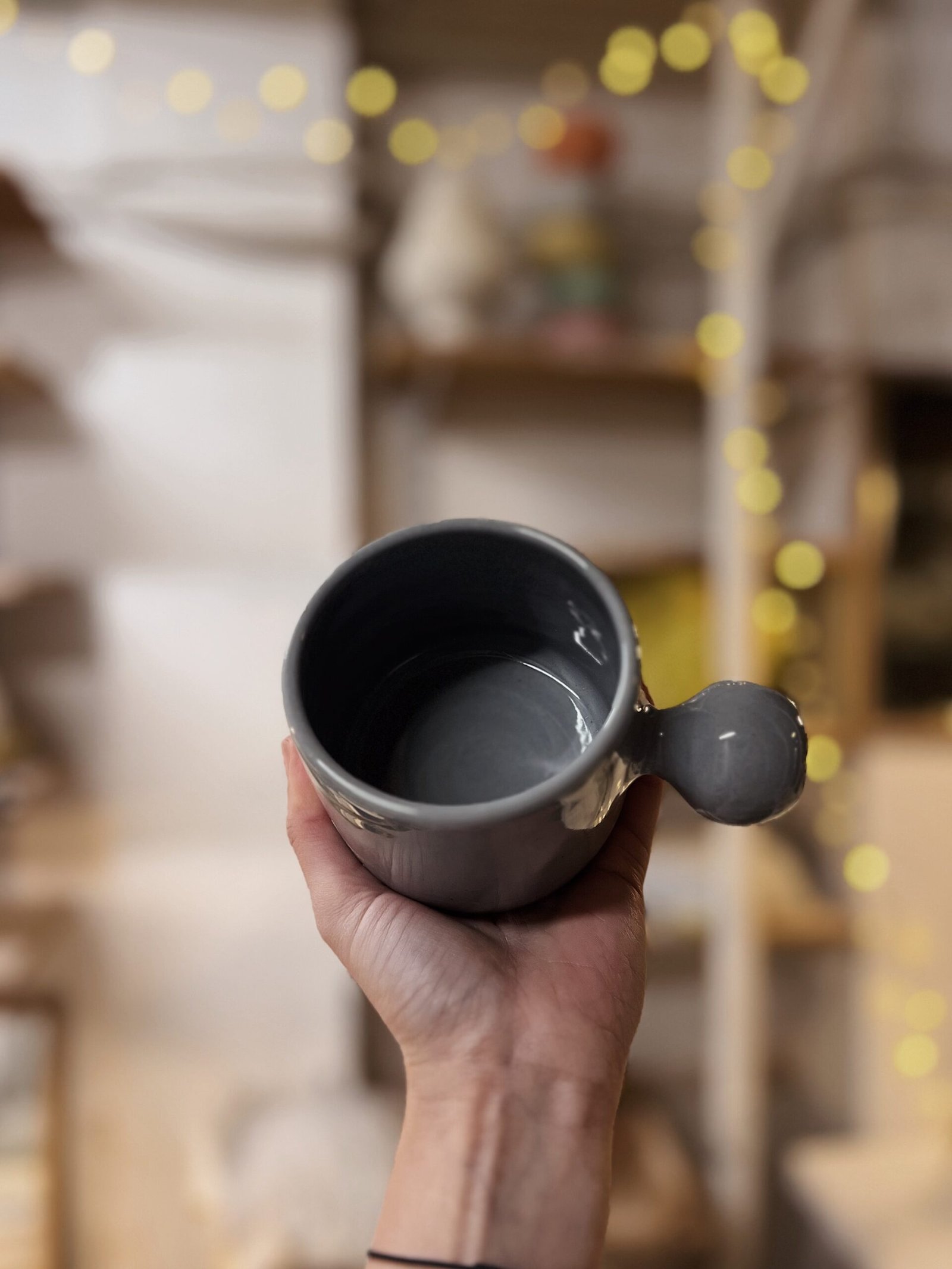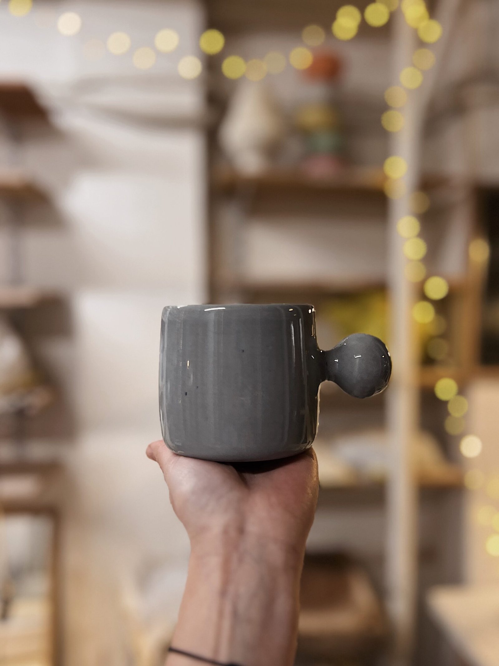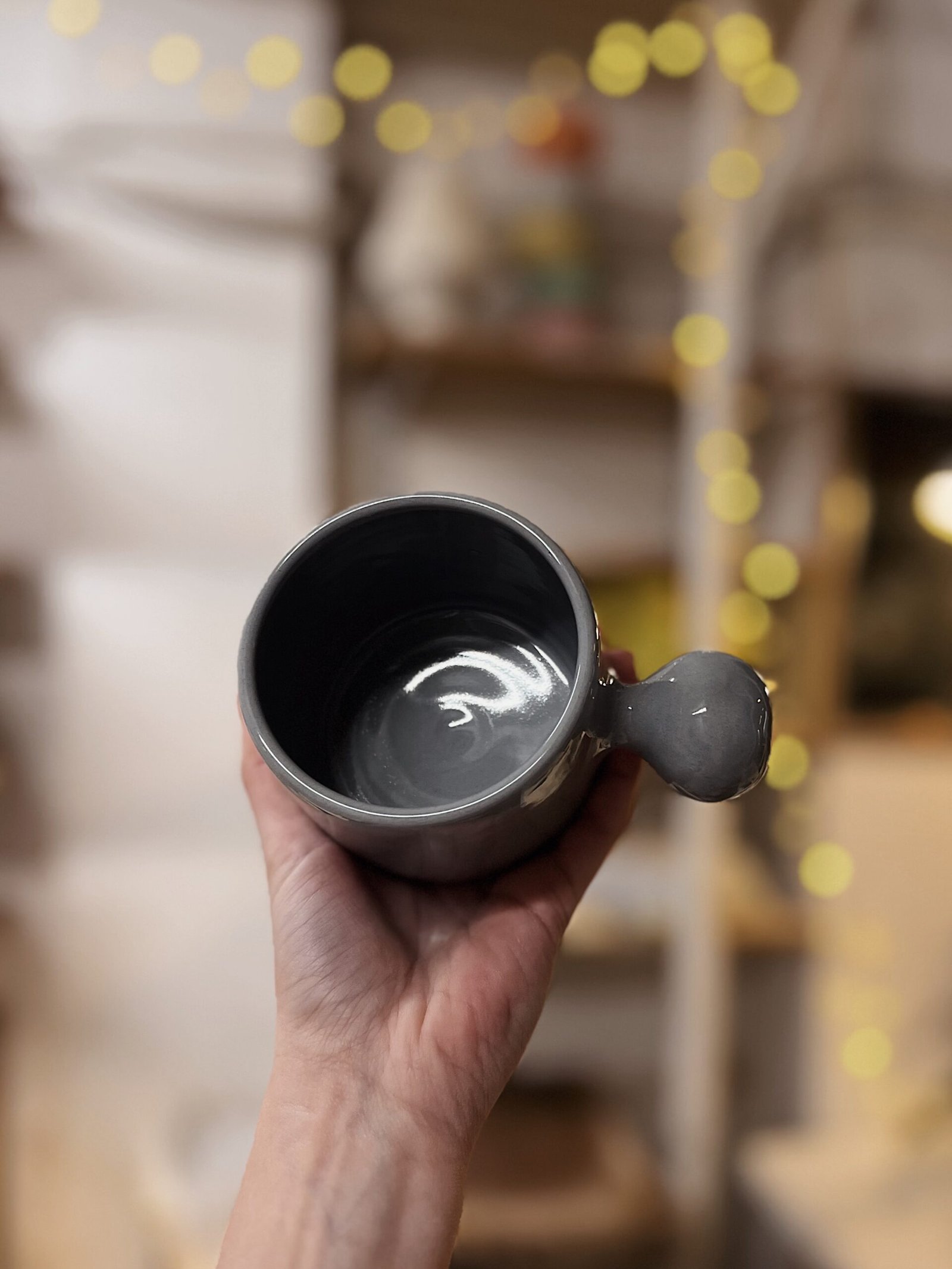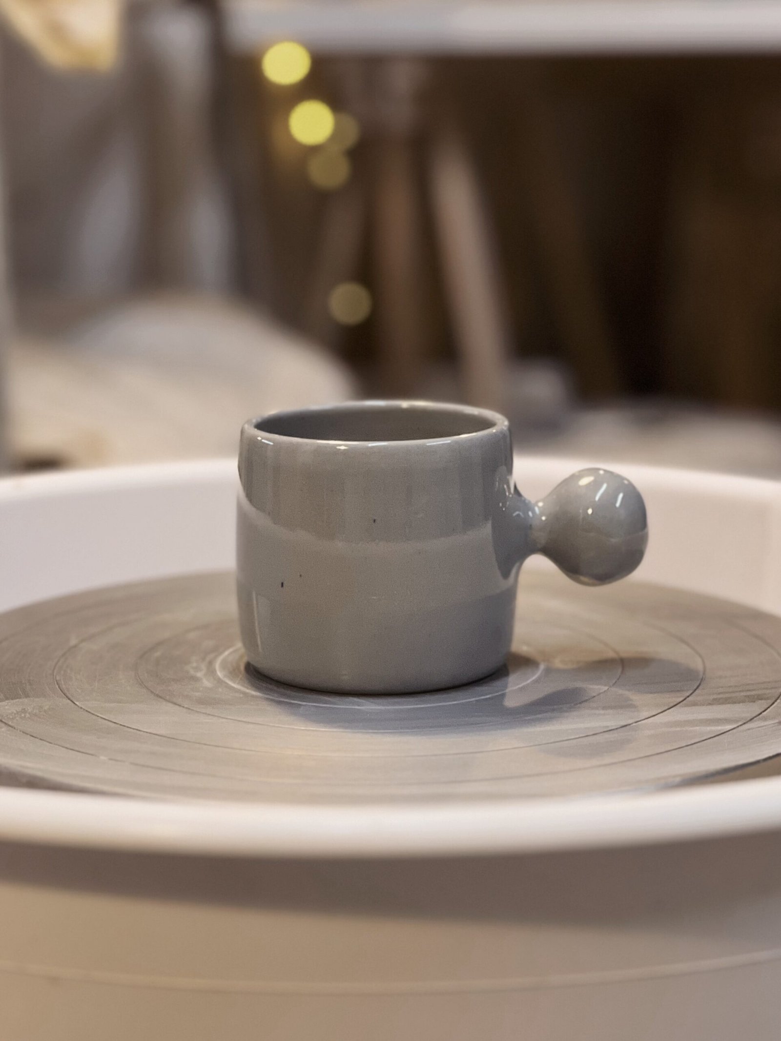 Esta taza está hecha a torno con gres de alta temperatura coloreada con cobalto y esmaltada en transparente. Es una pieza única, con un asa muy particular en forma de botón, que la hace especial. Pensada para que ésta no moleste y puedas abrazarla con las manos mientras te tomas tu bebida caliente favorita.