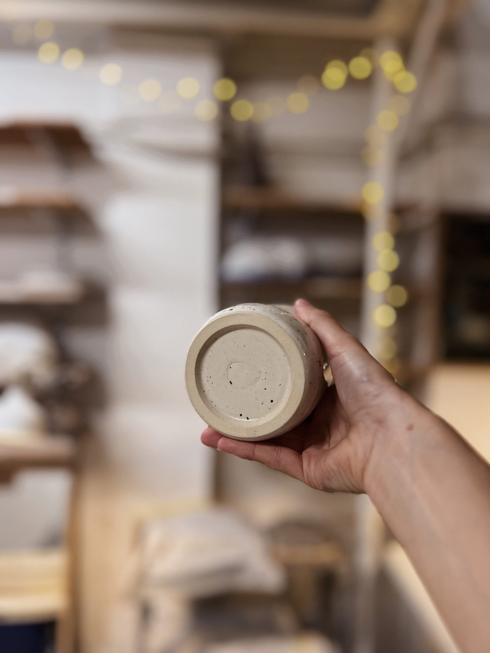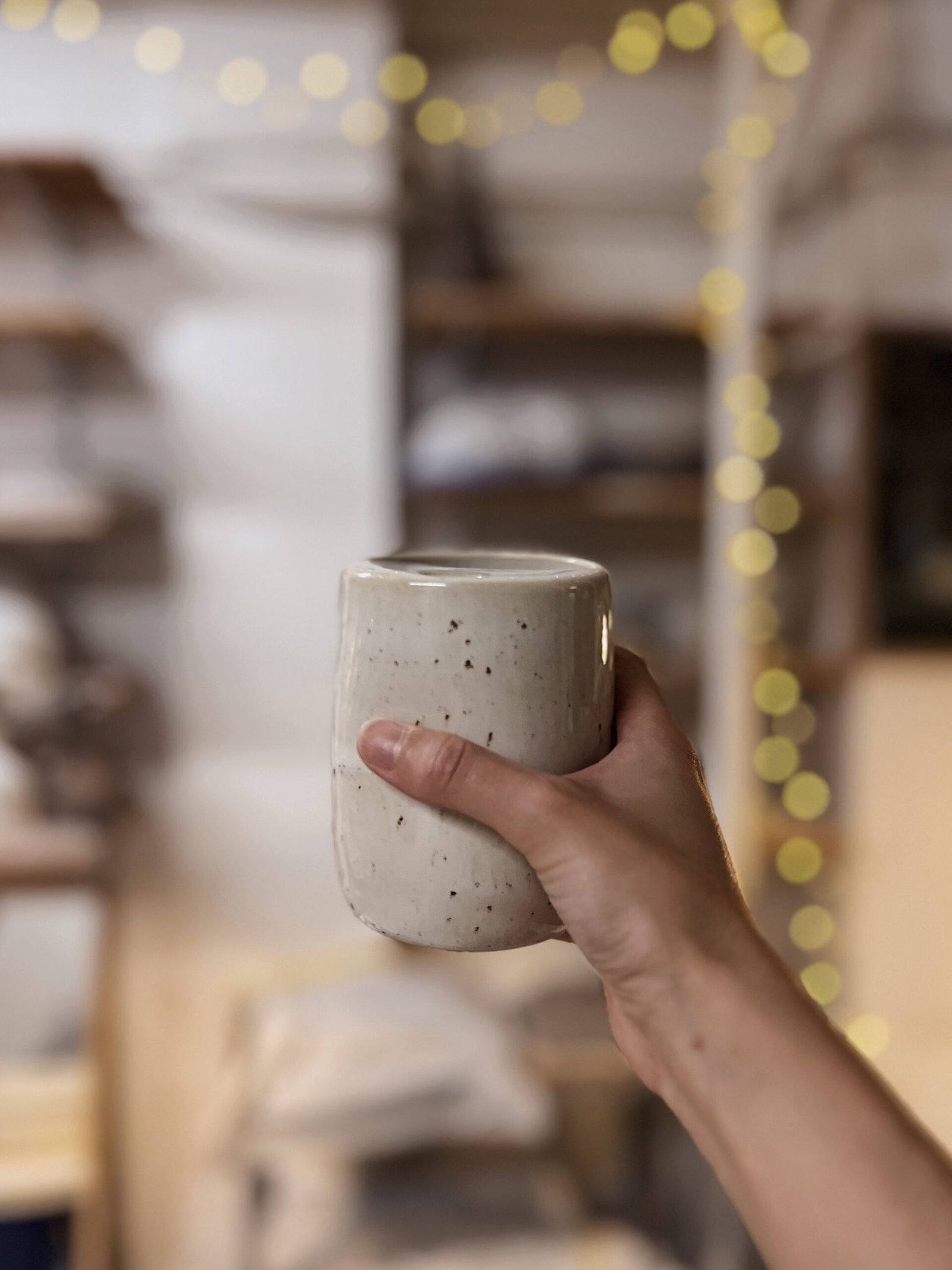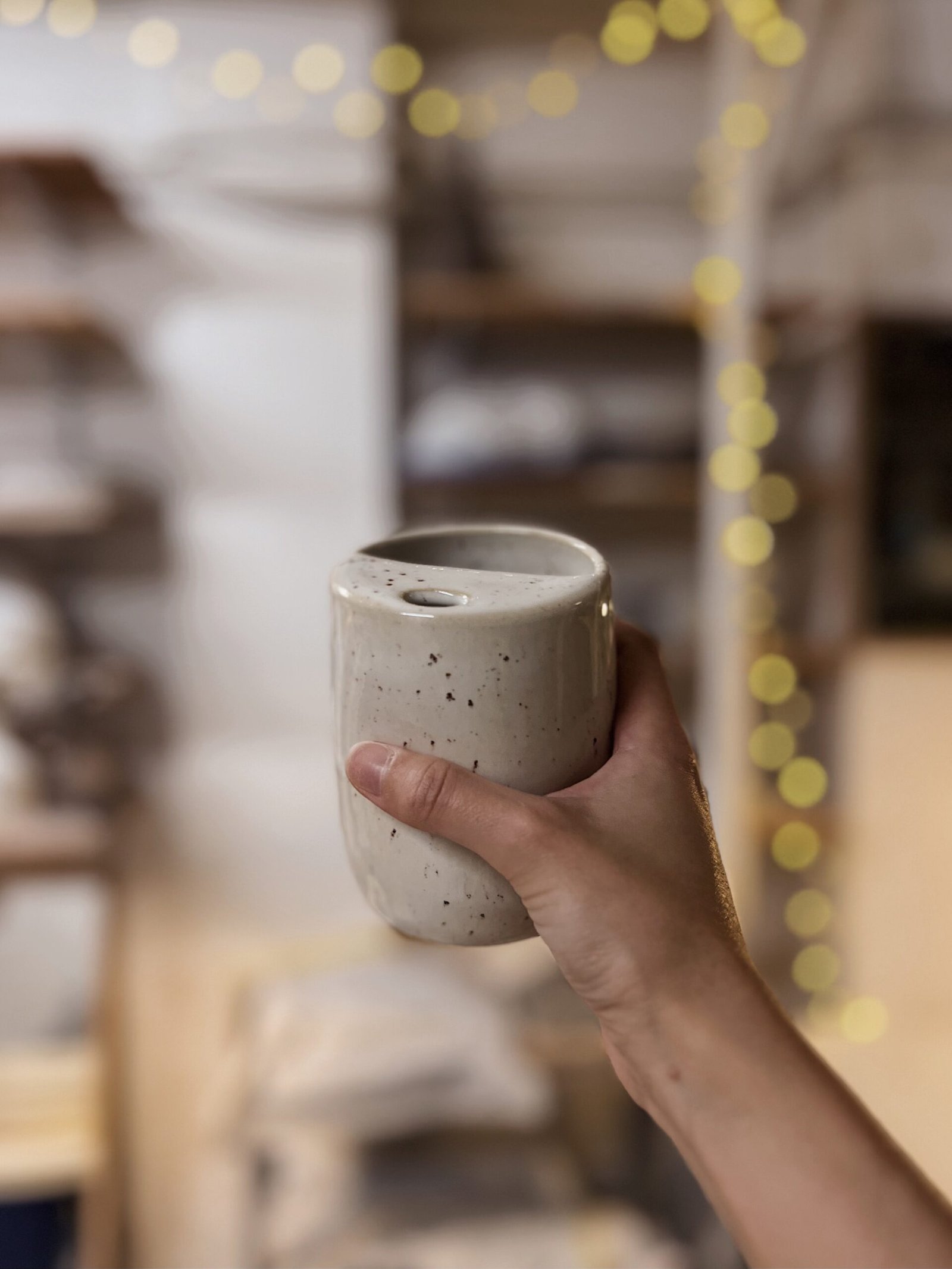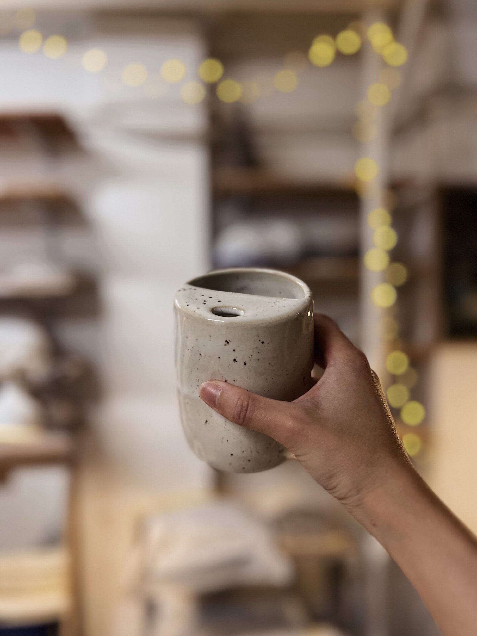 Esta taza está hecha en torno, la forma de pellizco y la tapa superior la hacen perfecta para adaptarse a tu mano y llevarte tu bebida favorita allá donde sea. Color blanco moteado.
