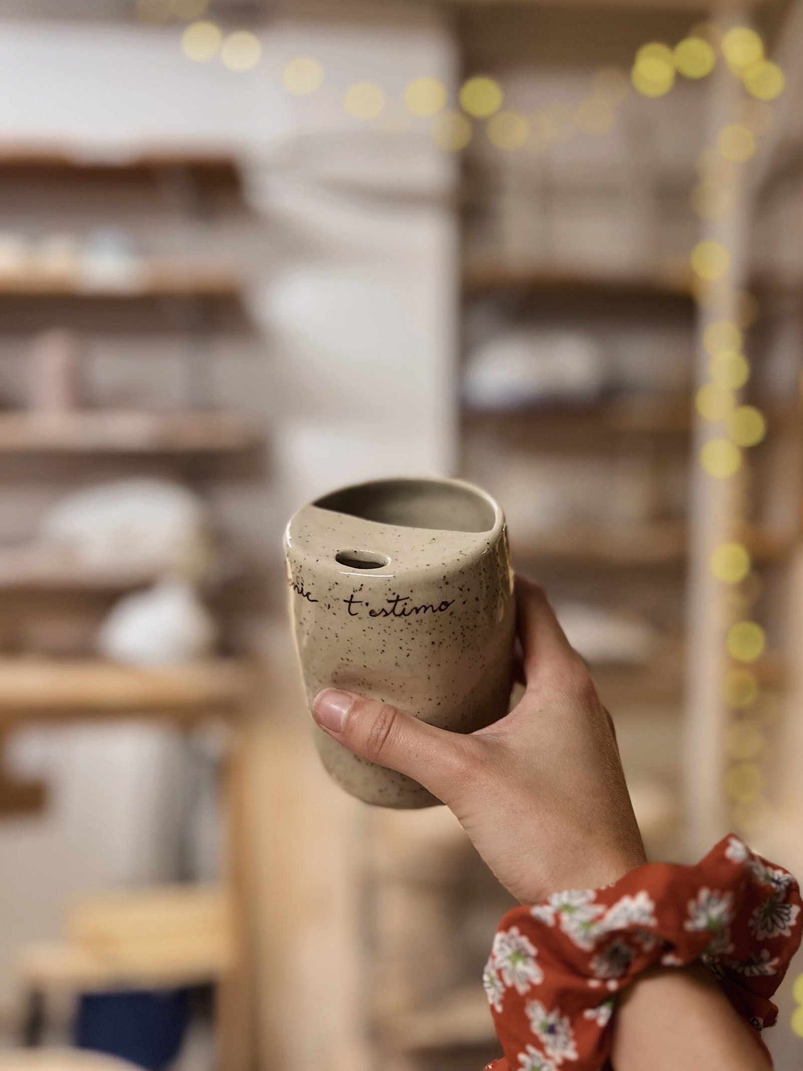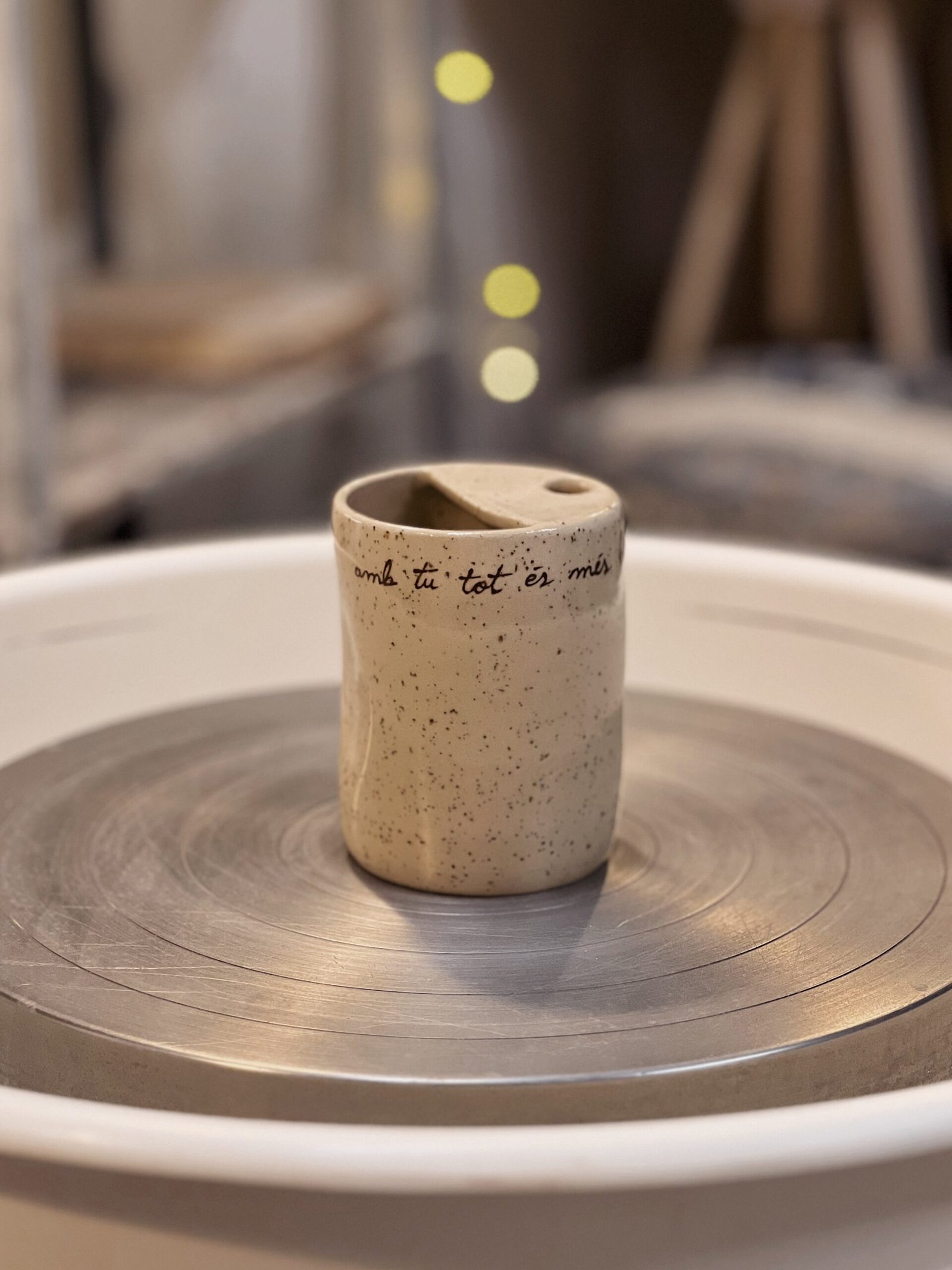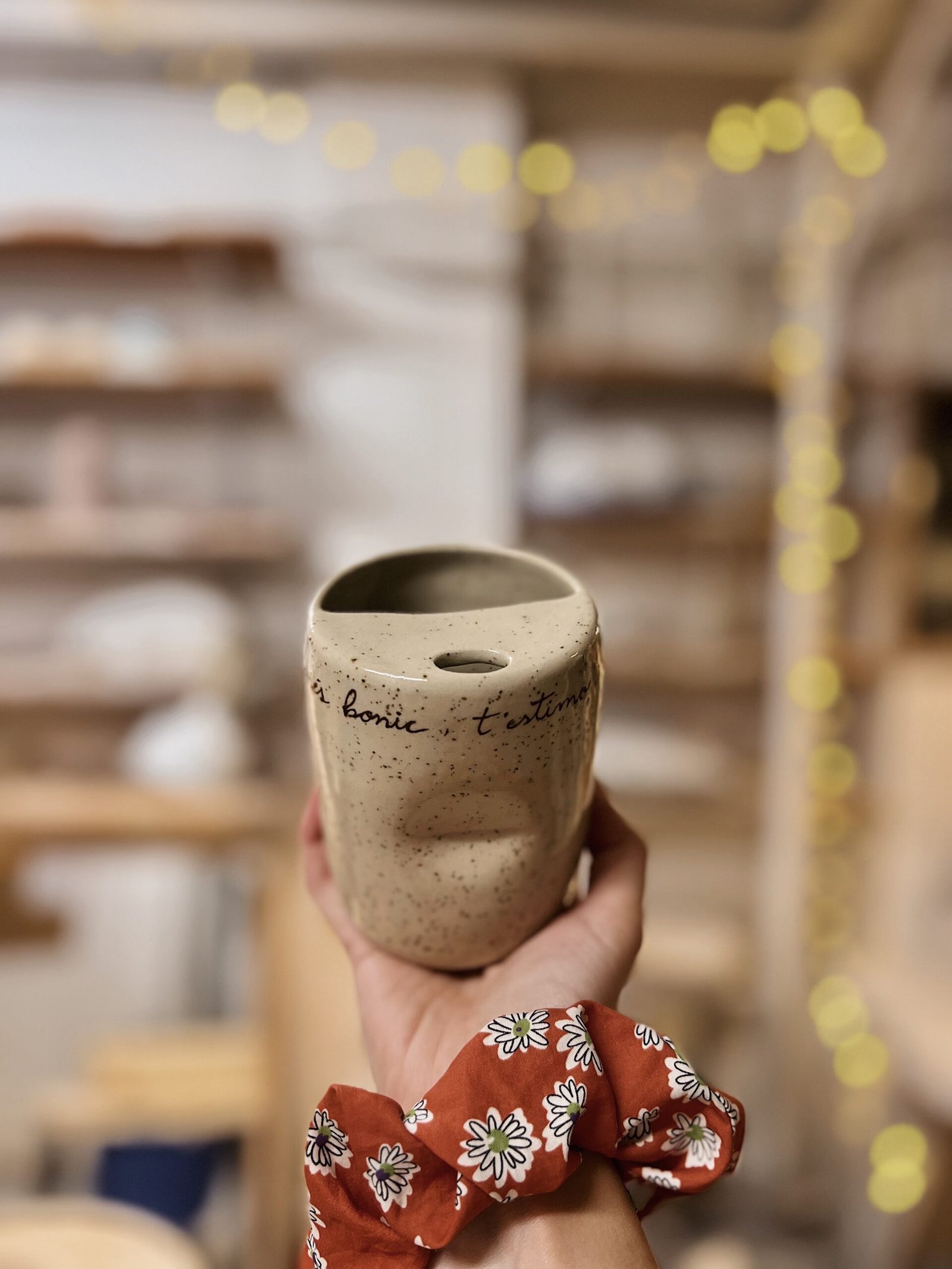 Esta taza está hecha en torno, la forma de pellizco y la tapa superior la hacen perfecta para adaptarse a tu mano y llevarte tu bebida favorita allá donde sea. Color crema moteado texto escrito a mano con engobe marrón. Puedes personalizar esta taza con tu mensaje [contacto].