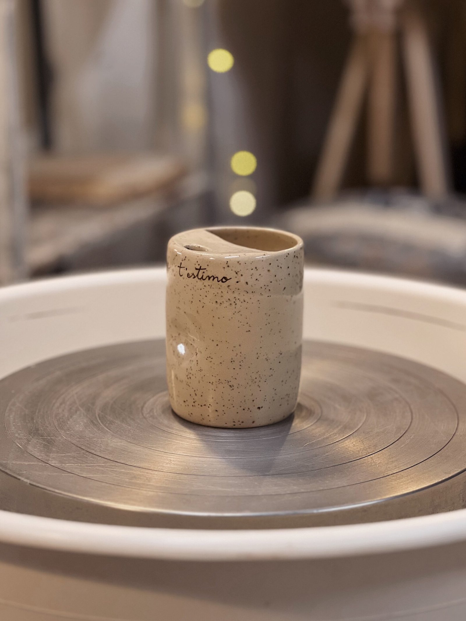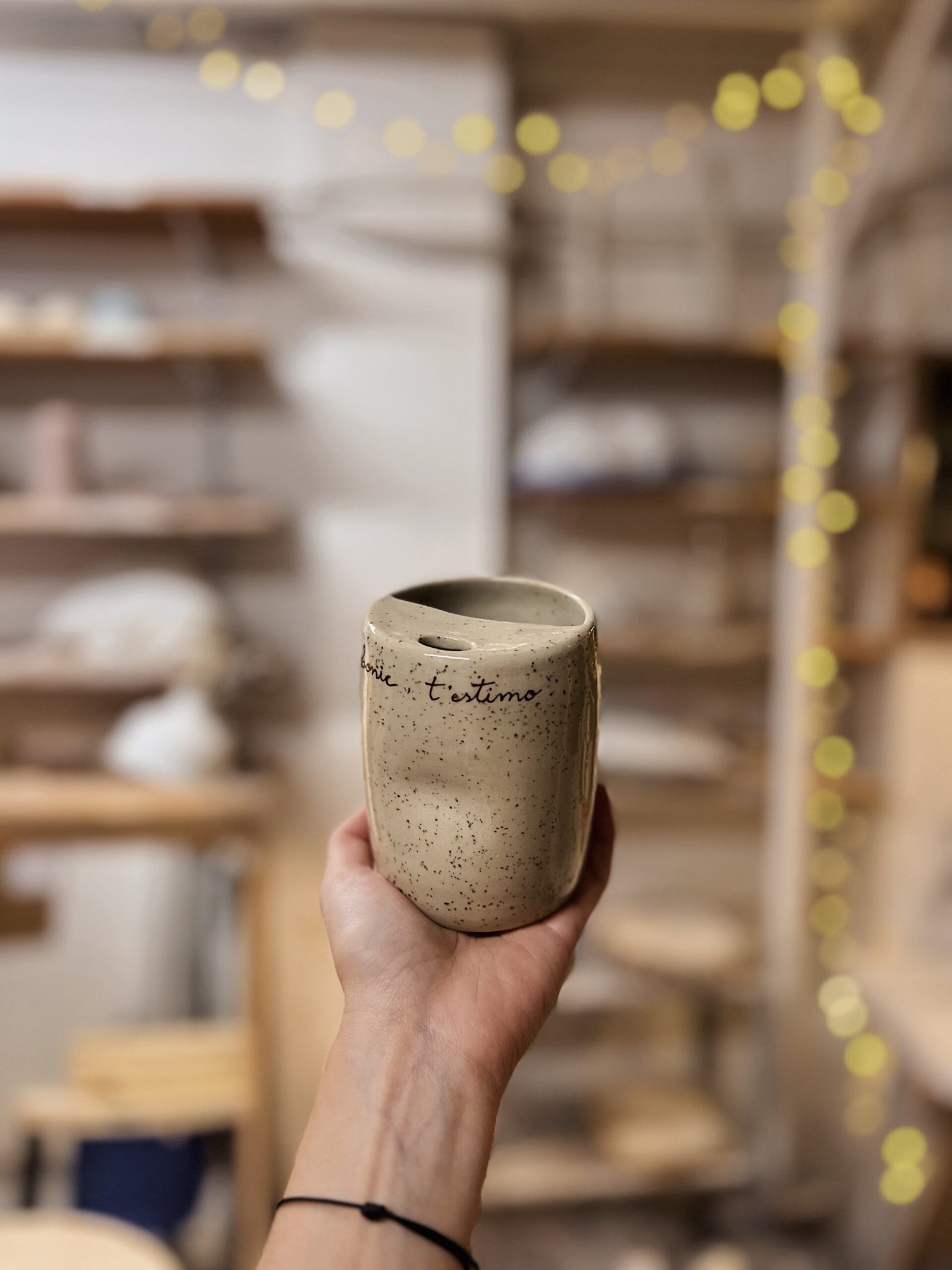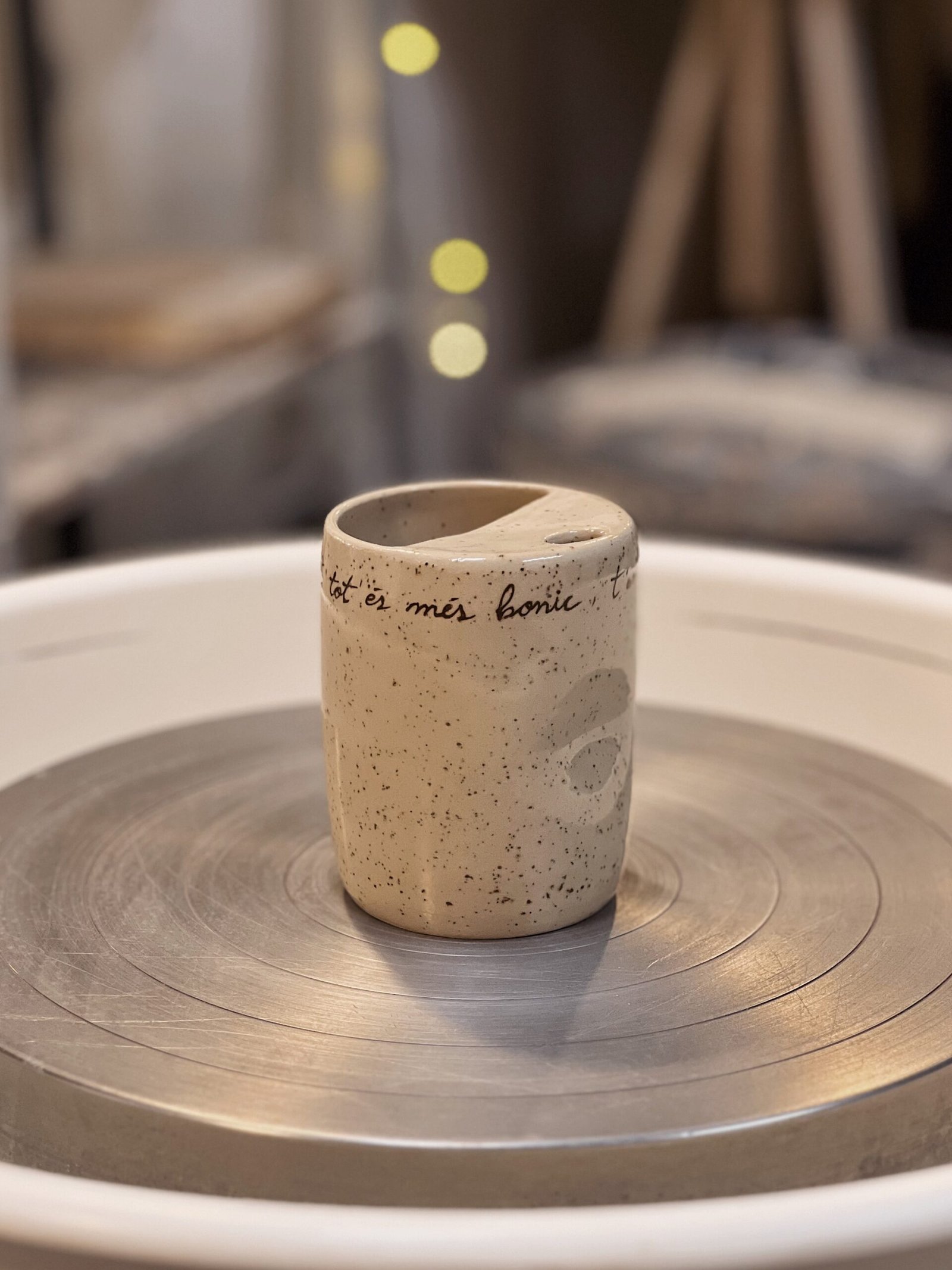 Esta taza está hecha en torno, la forma de pellizco y la tapa superior la hacen perfecta para adaptarse a tu mano y llevarte tu bebida favorita allá donde sea. Color crema moteado texto escrito a mano con engobe marrón. Puedes personalizar esta taza con tu mensaje [contacto].