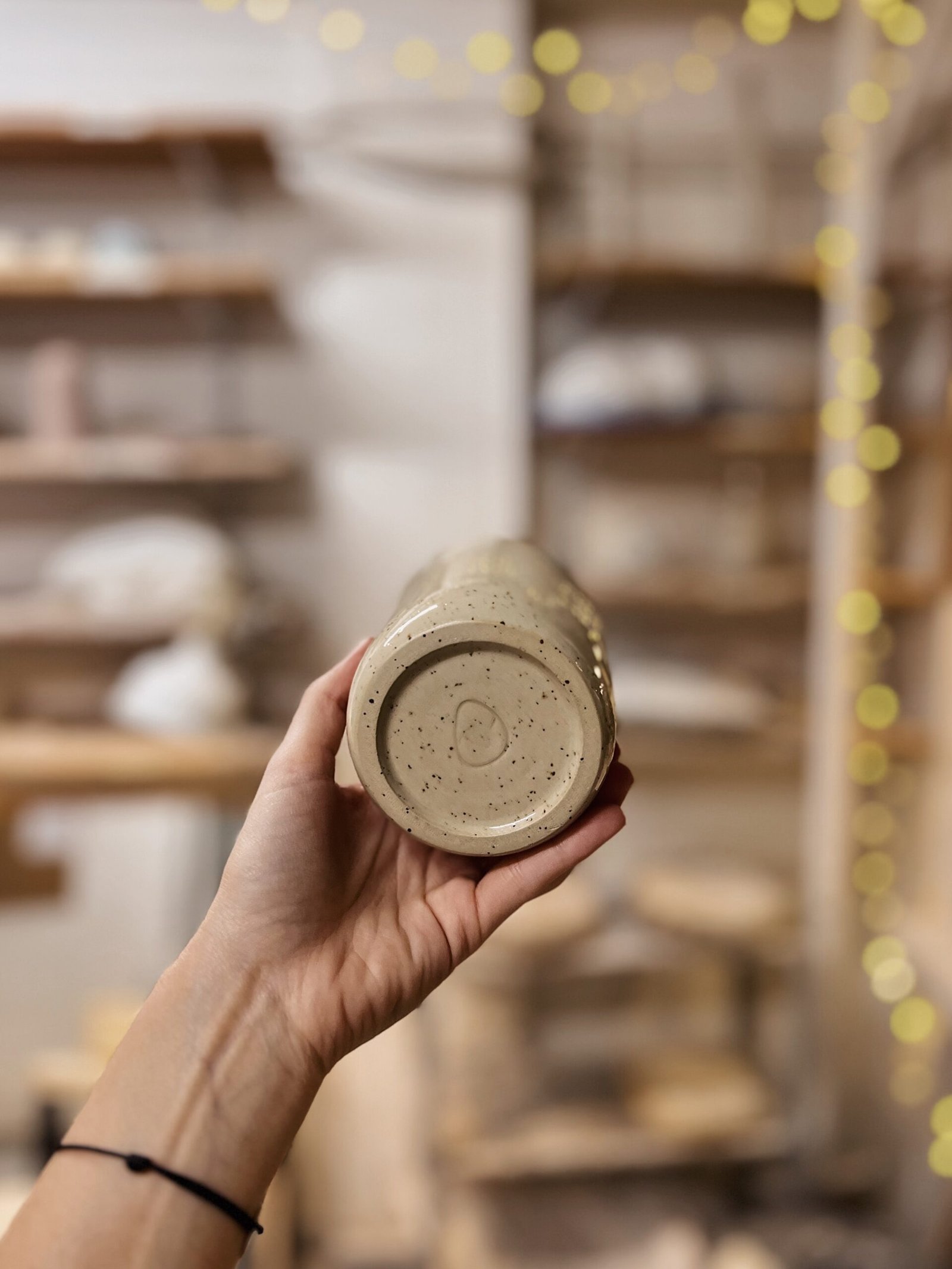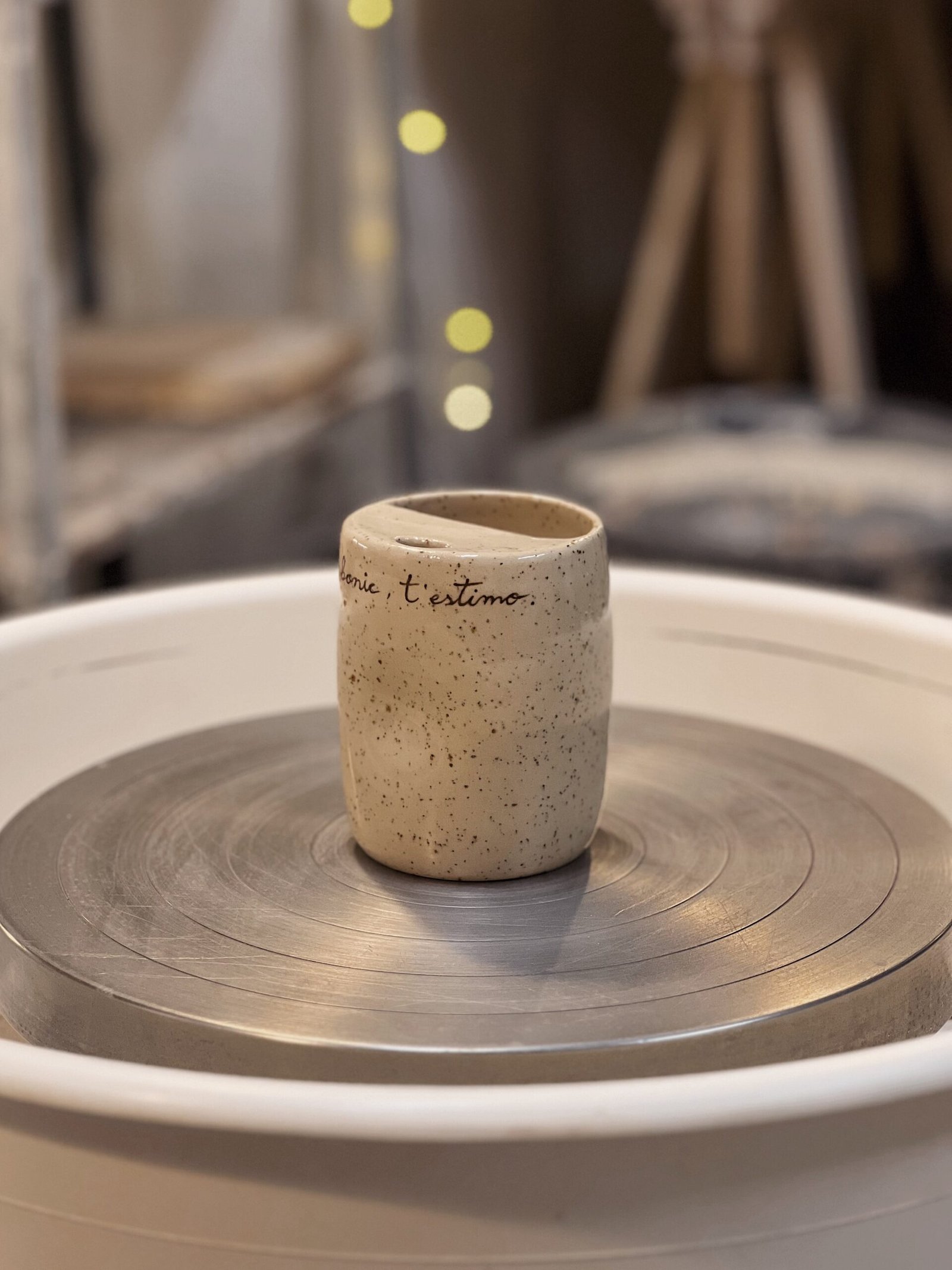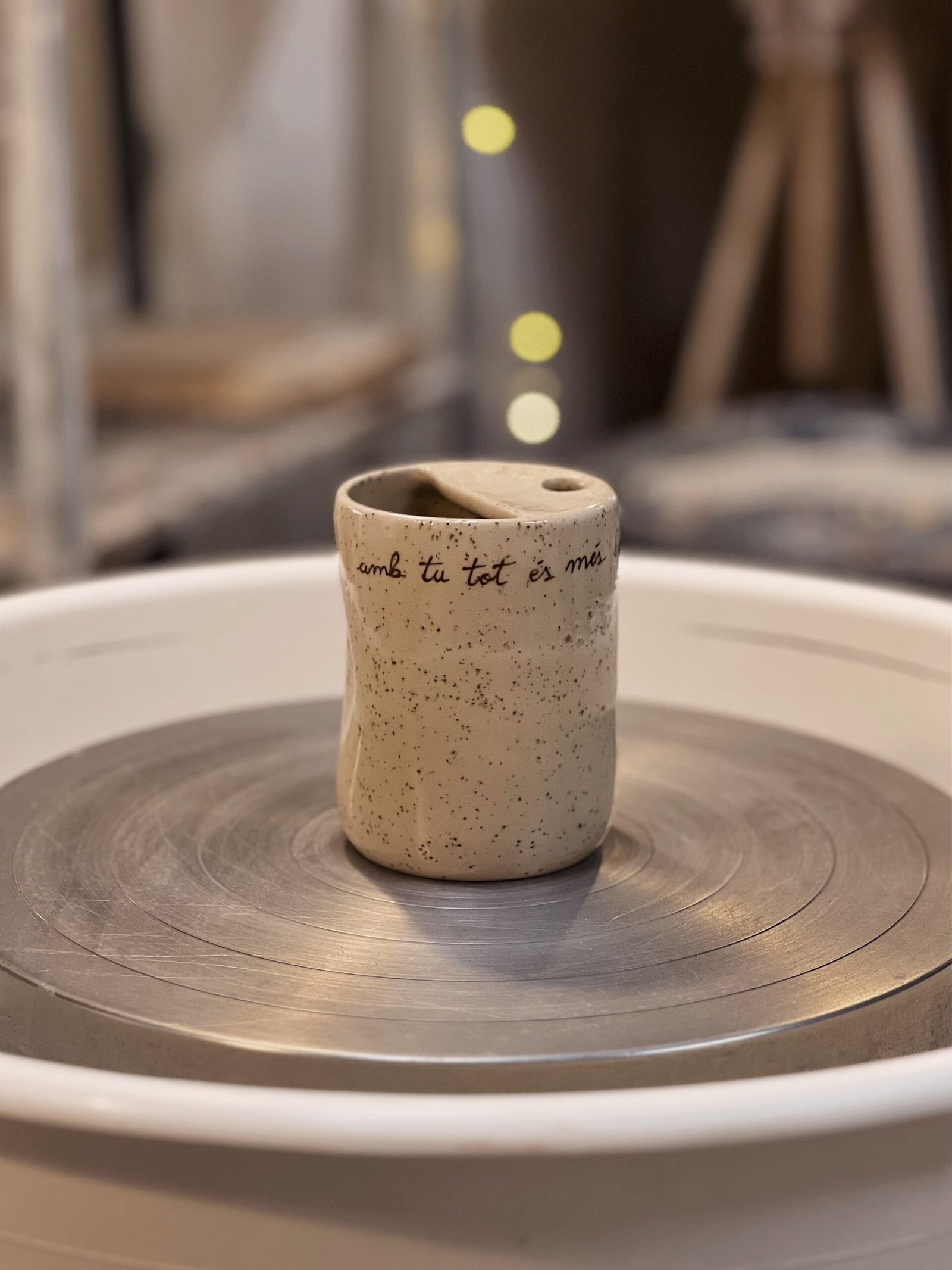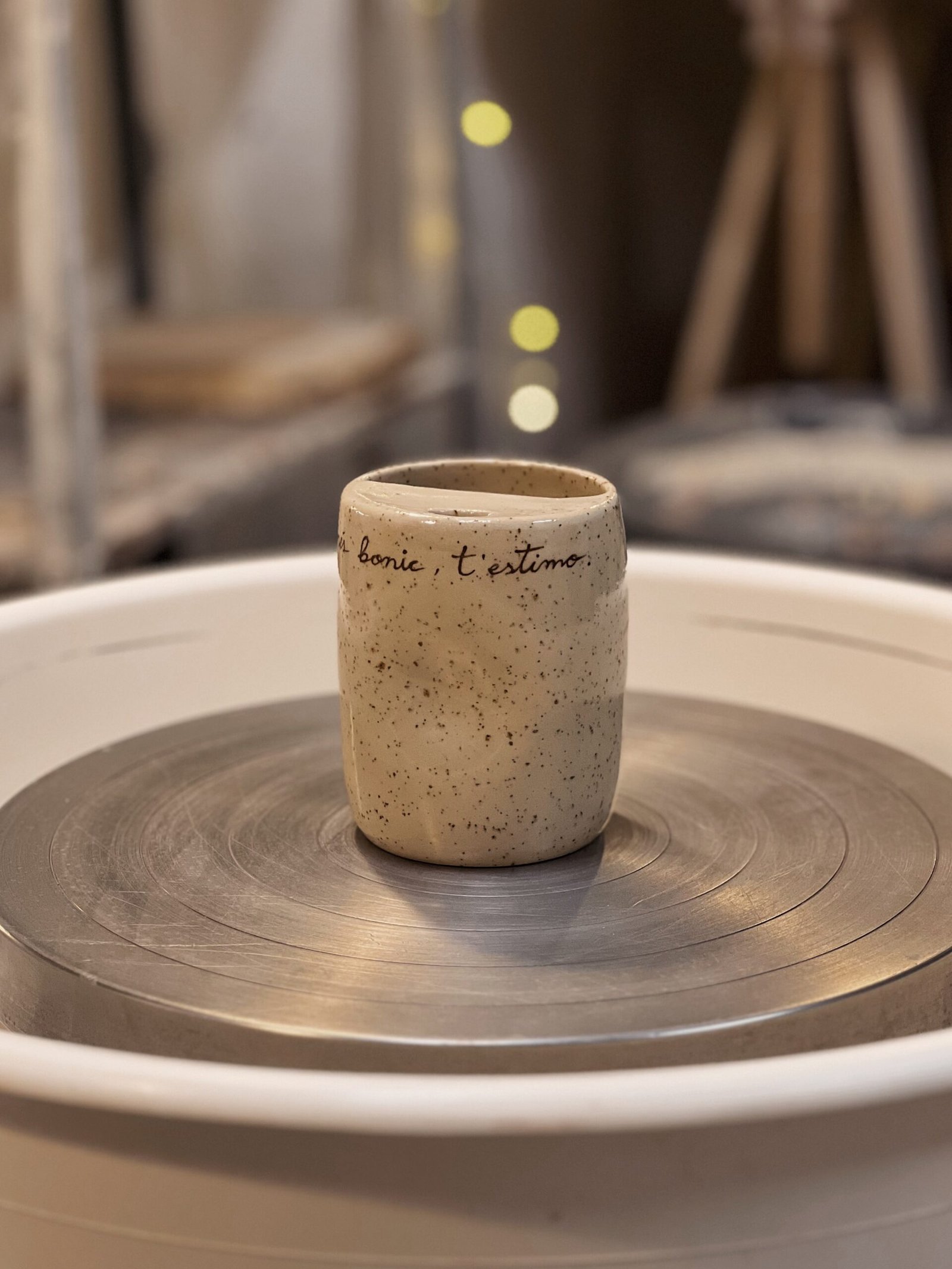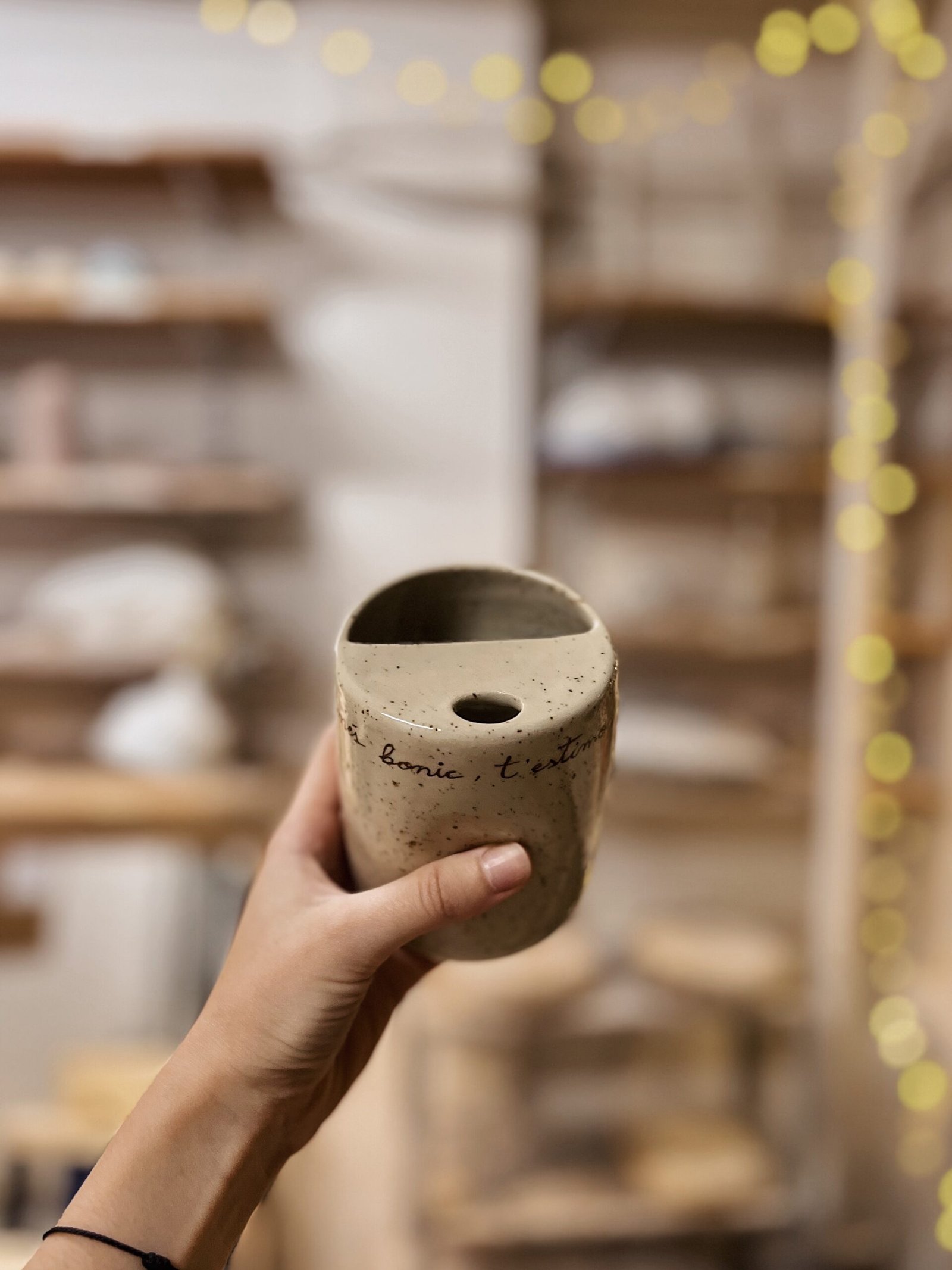 Esta taza está hecha en torno, la forma de pellizco y la tapa superior la hacen perfecta para adaptarse a tu mano y llevarte tu bebida favorita allá donde sea. Color crema moteado texto escrito a mano con engobe marrón. Puedes personalizar esta taza con tu mensaje [contacto].