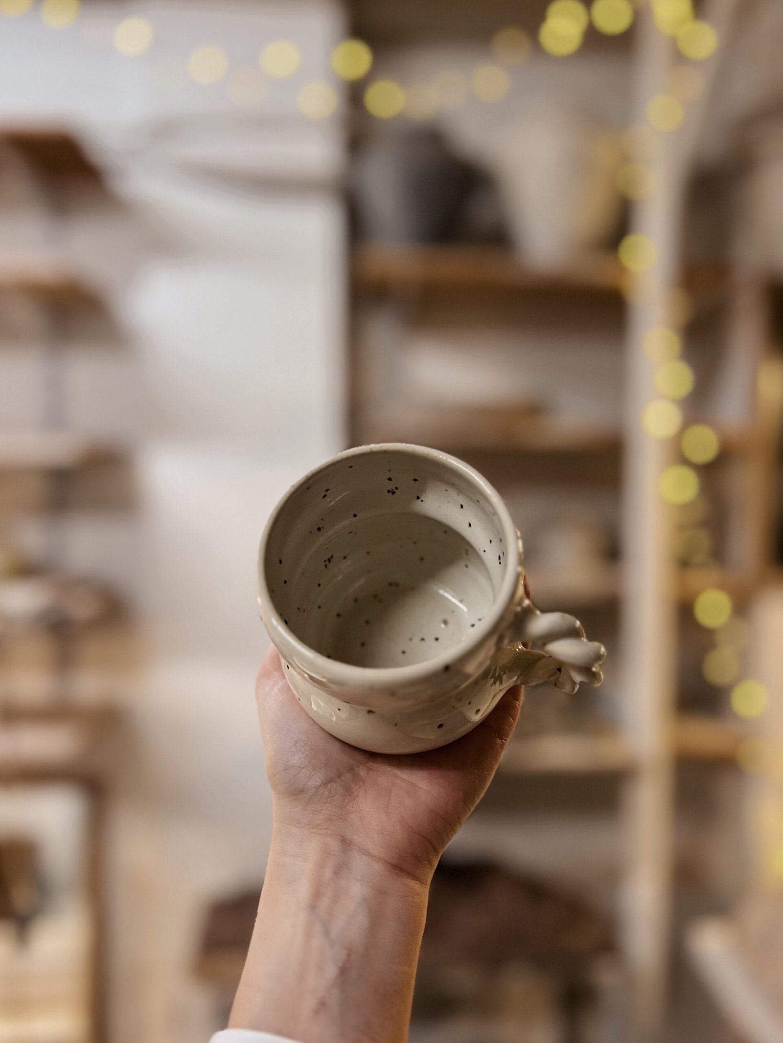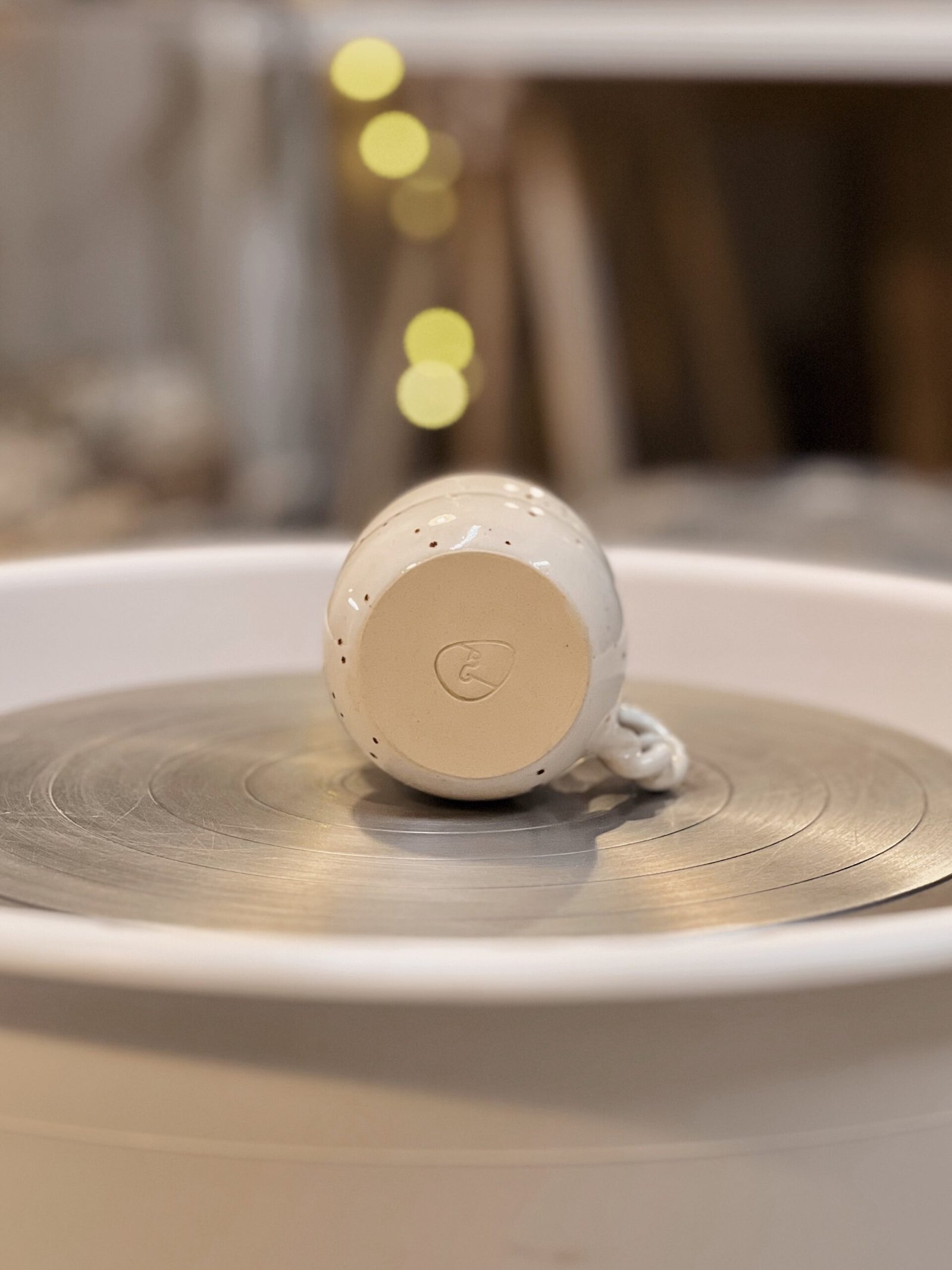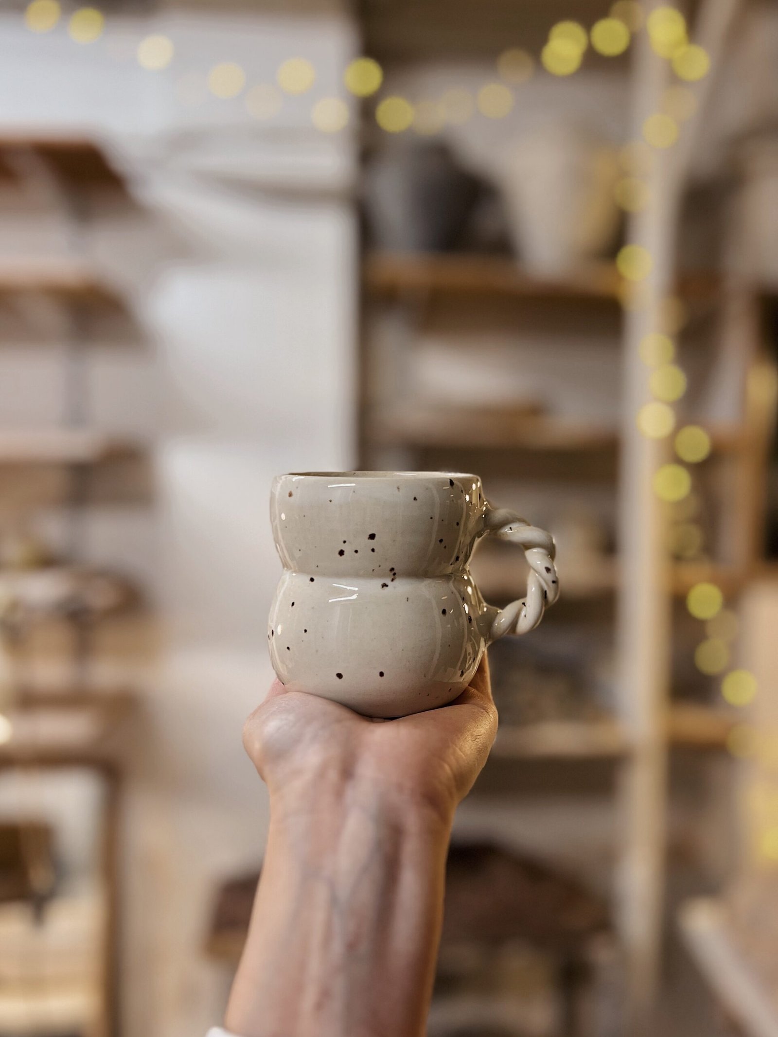 Esta taza está hecha con gres blanco de alta temperatura en torno alfarero, esmaltada en color blanco moteado y asa trenzada.