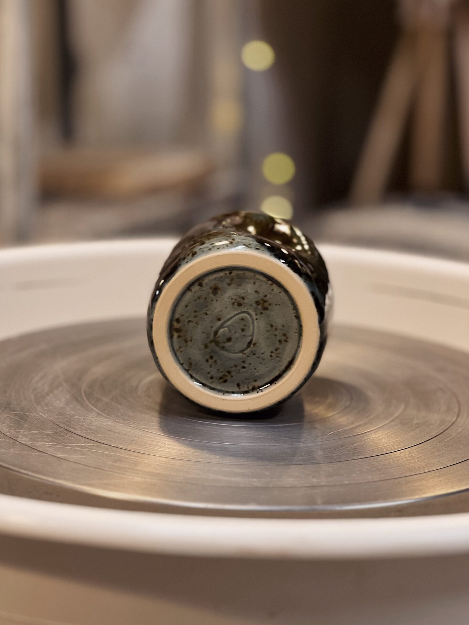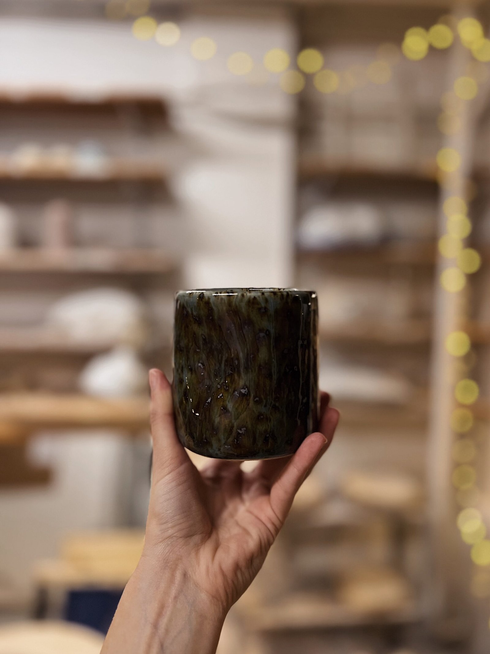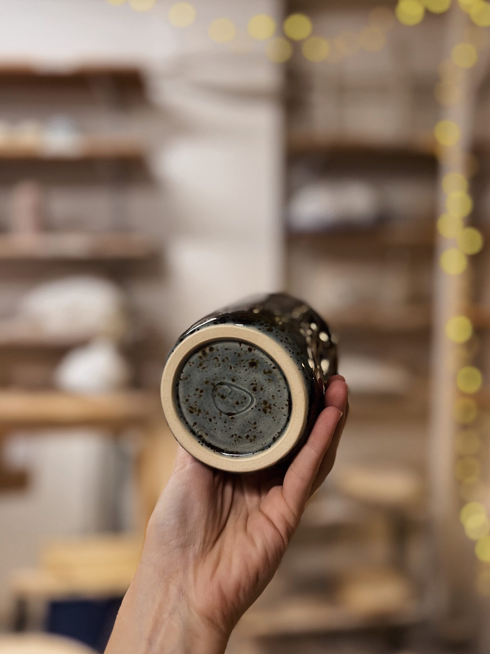Vaso o taza hecha en torno, la forma de pellizco hace que sea el vaso perfecto ya que se adapta a tu mano. Color azul moteado.