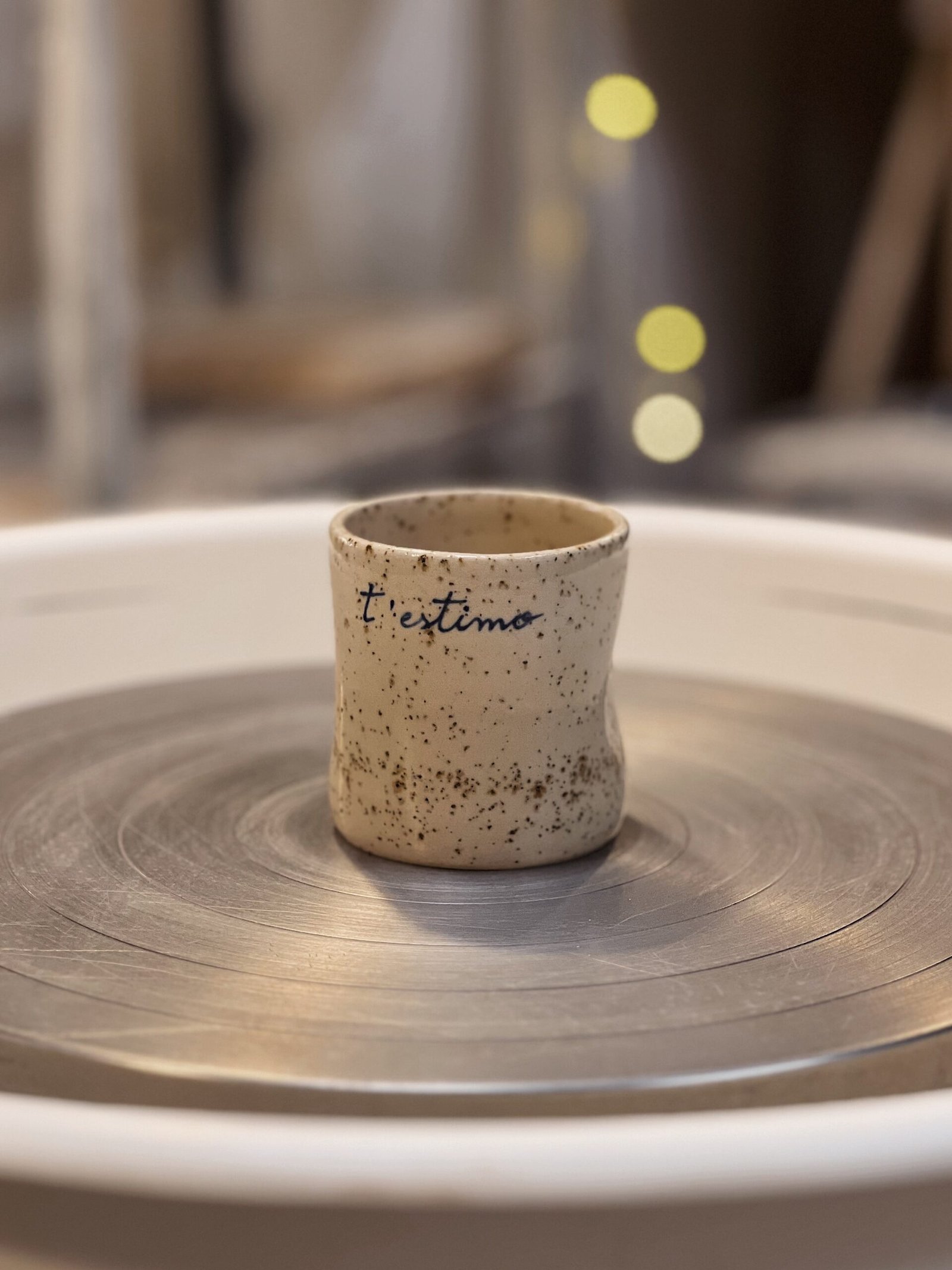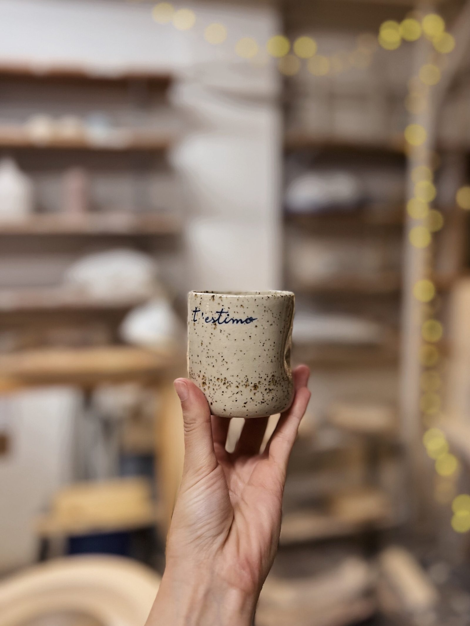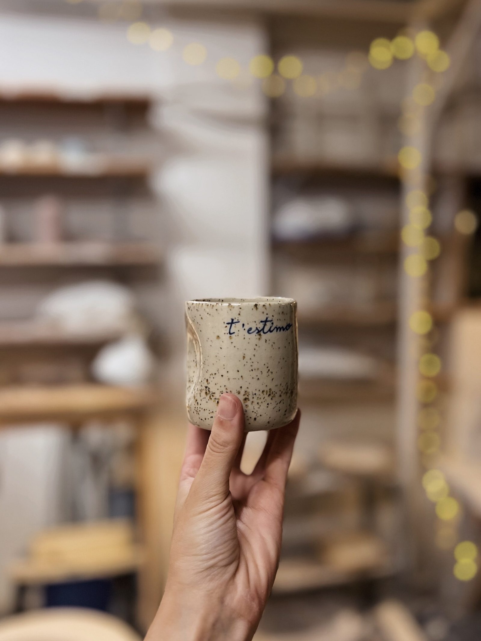 Este vaso está hecha con gres moteado de alta temperatura en torno alfarero, esmaltada en transparente con texto escrito a mano con engobe azul. La forma de pellizco hace que sea un vaso ergonómico ya que se adapta perfectamente a tu mano