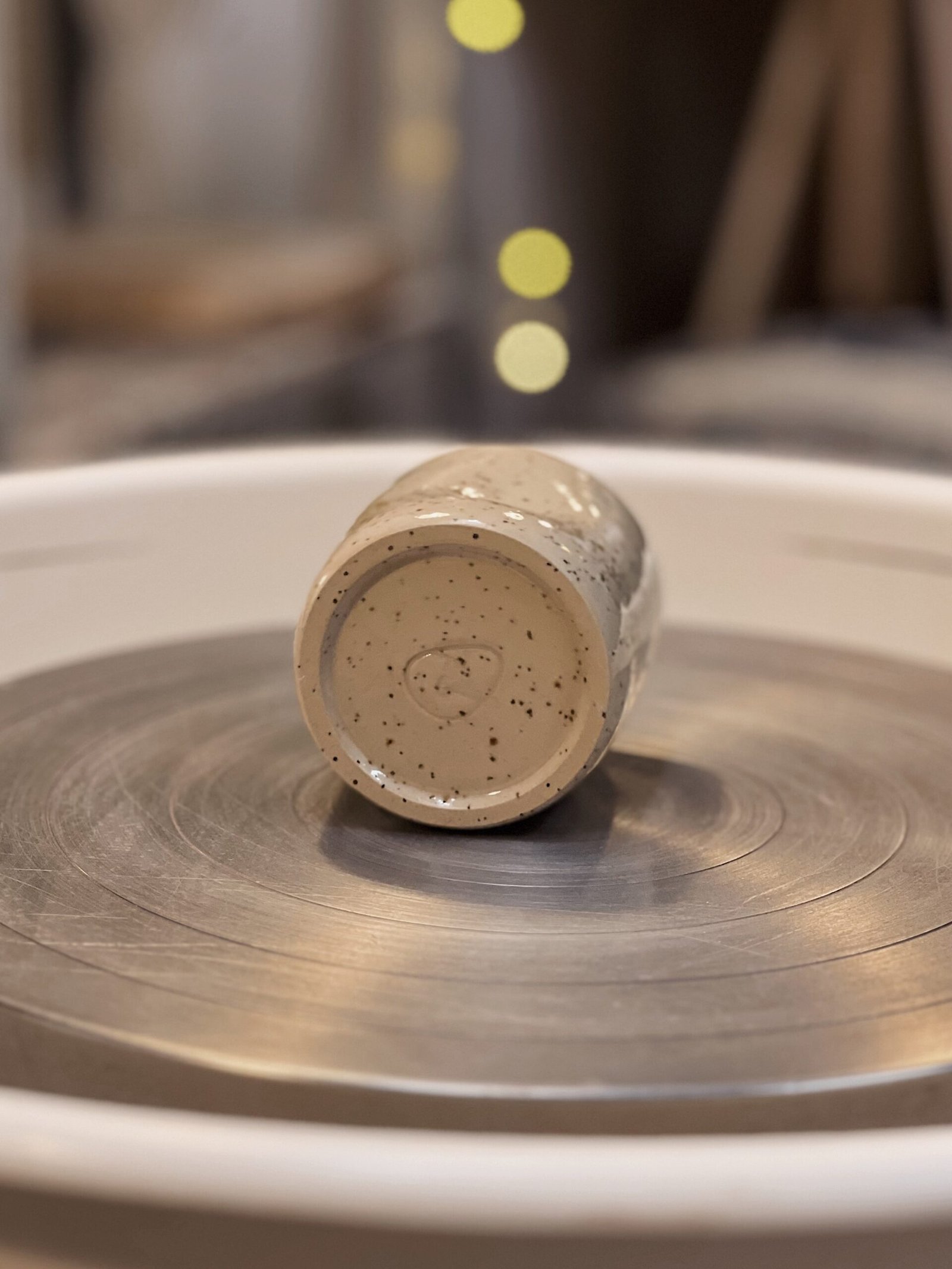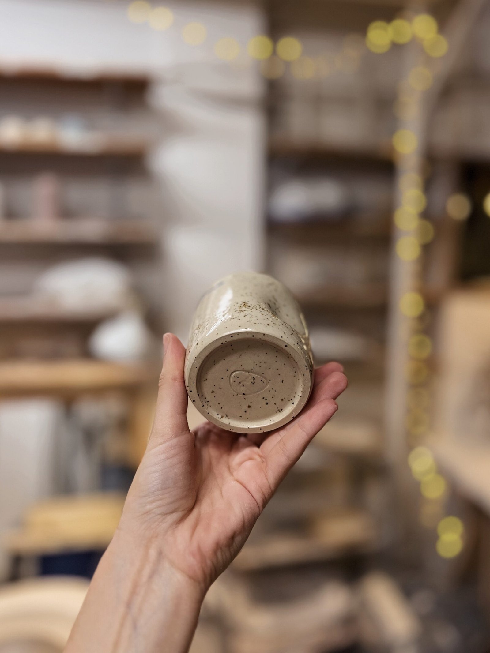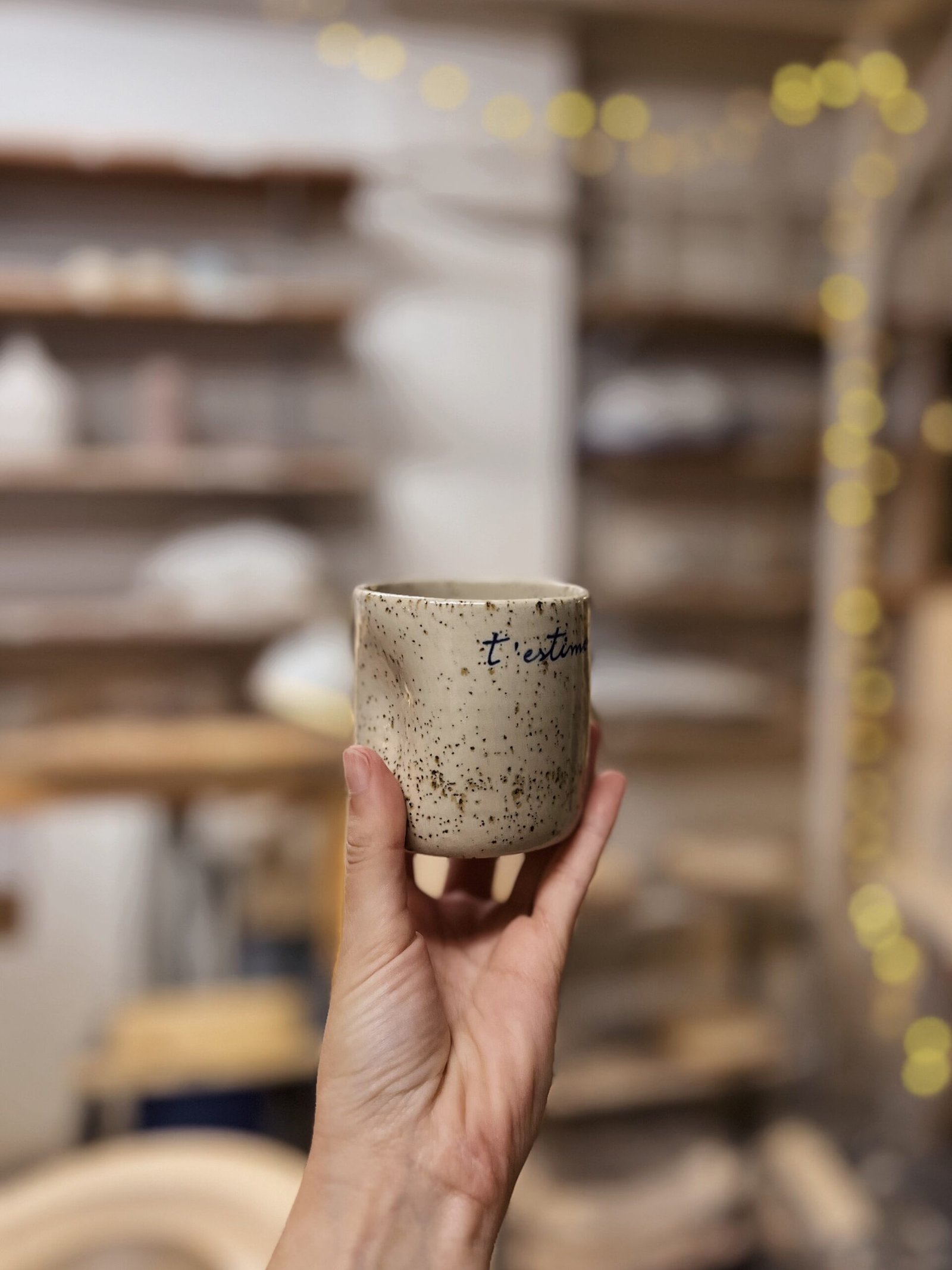 Este vaso está hecha con gres moteado de alta temperatura en torno alfarero, esmaltada en transparente con texto escrito a mano con engobe azul. La forma de pellizco hace que sea un vaso ergonómico ya que se adapta perfectamente a tu mano