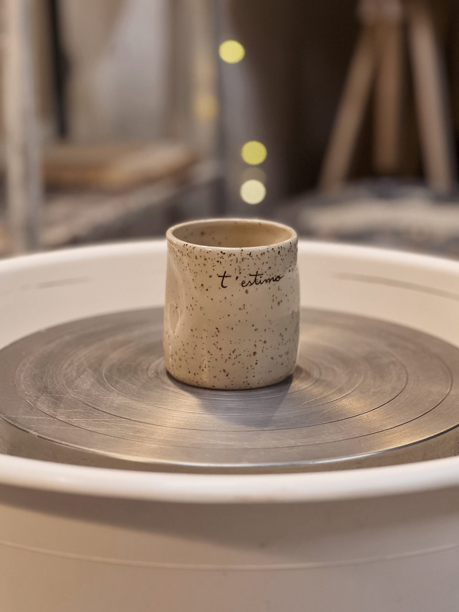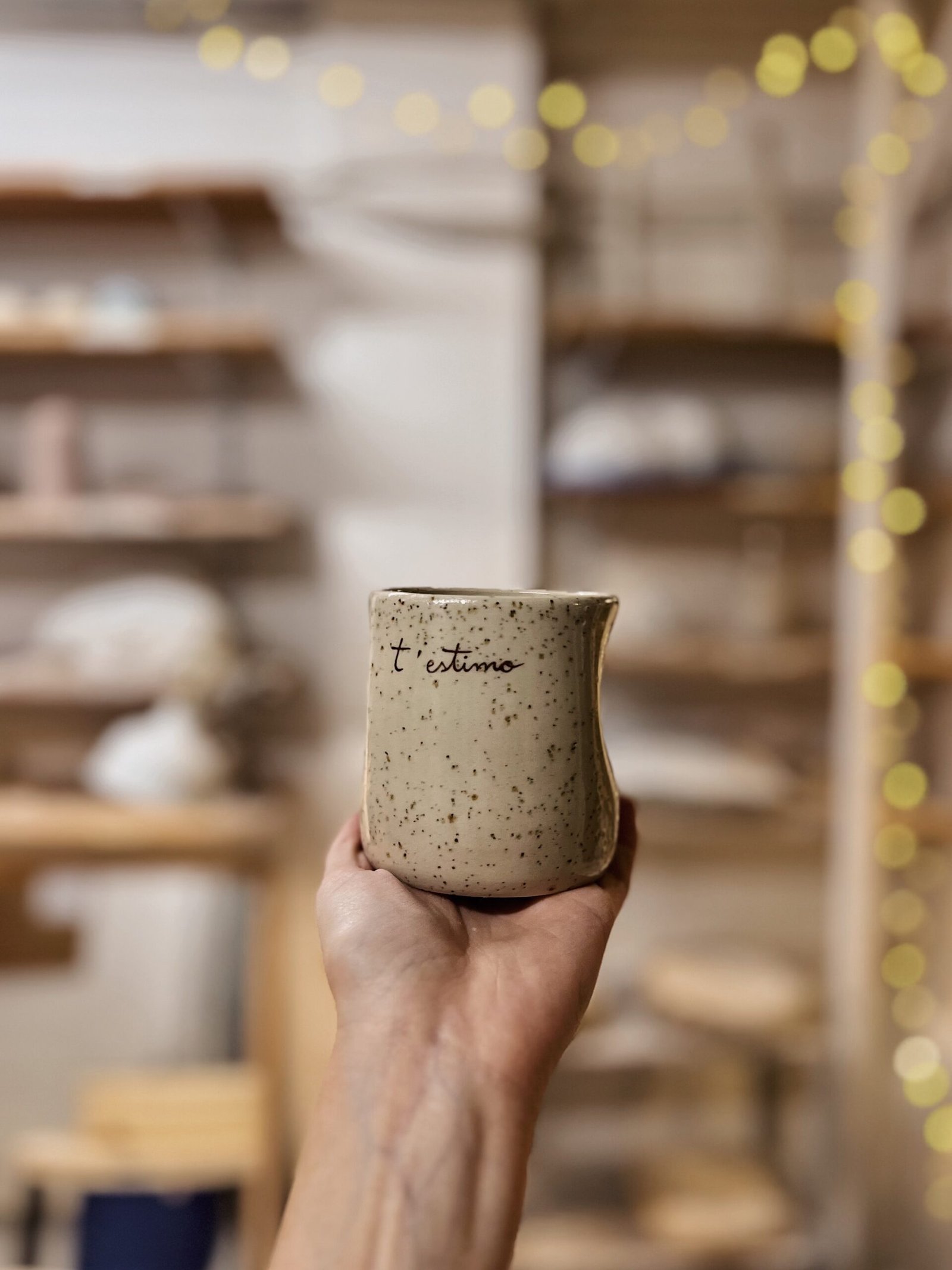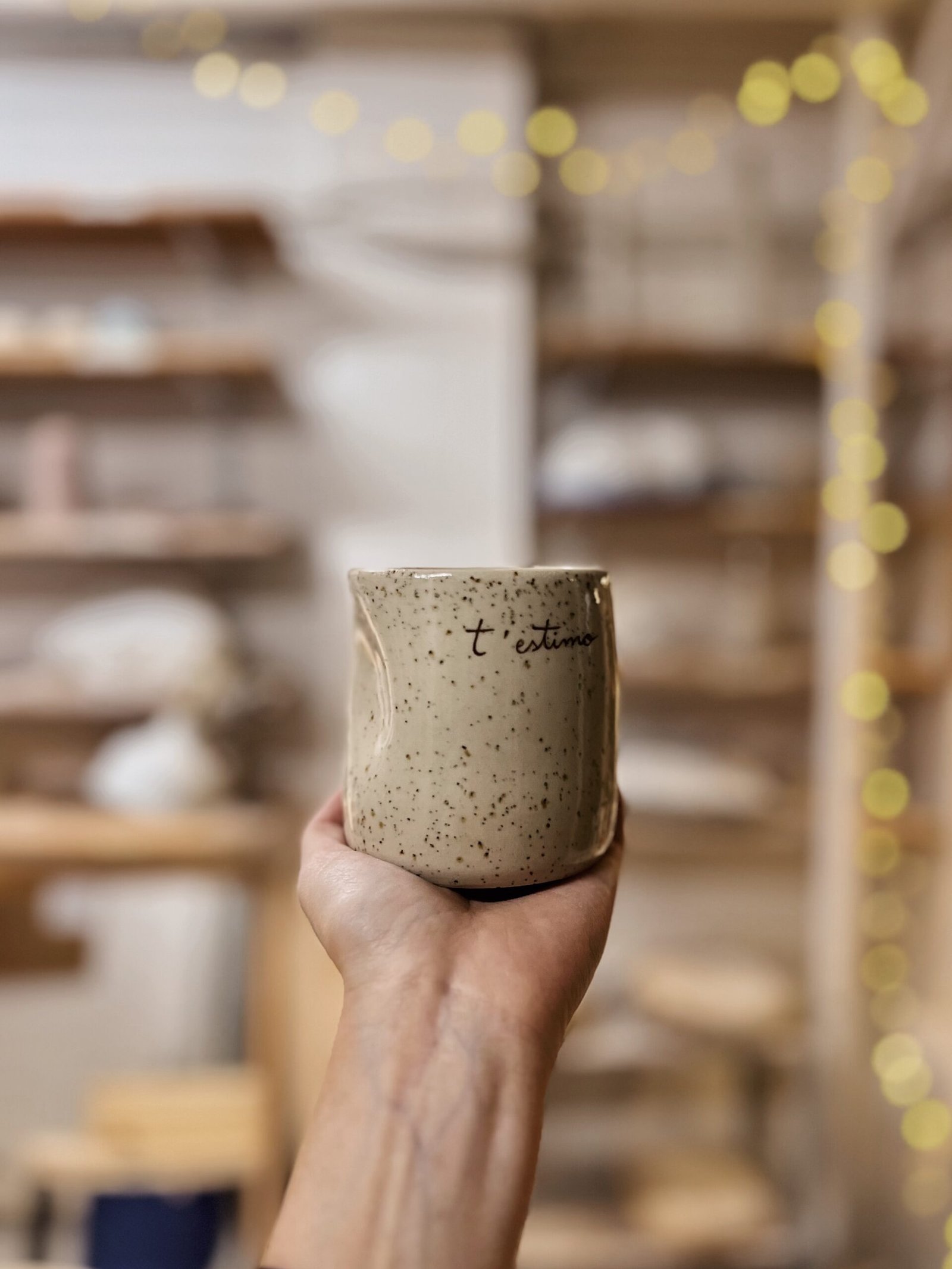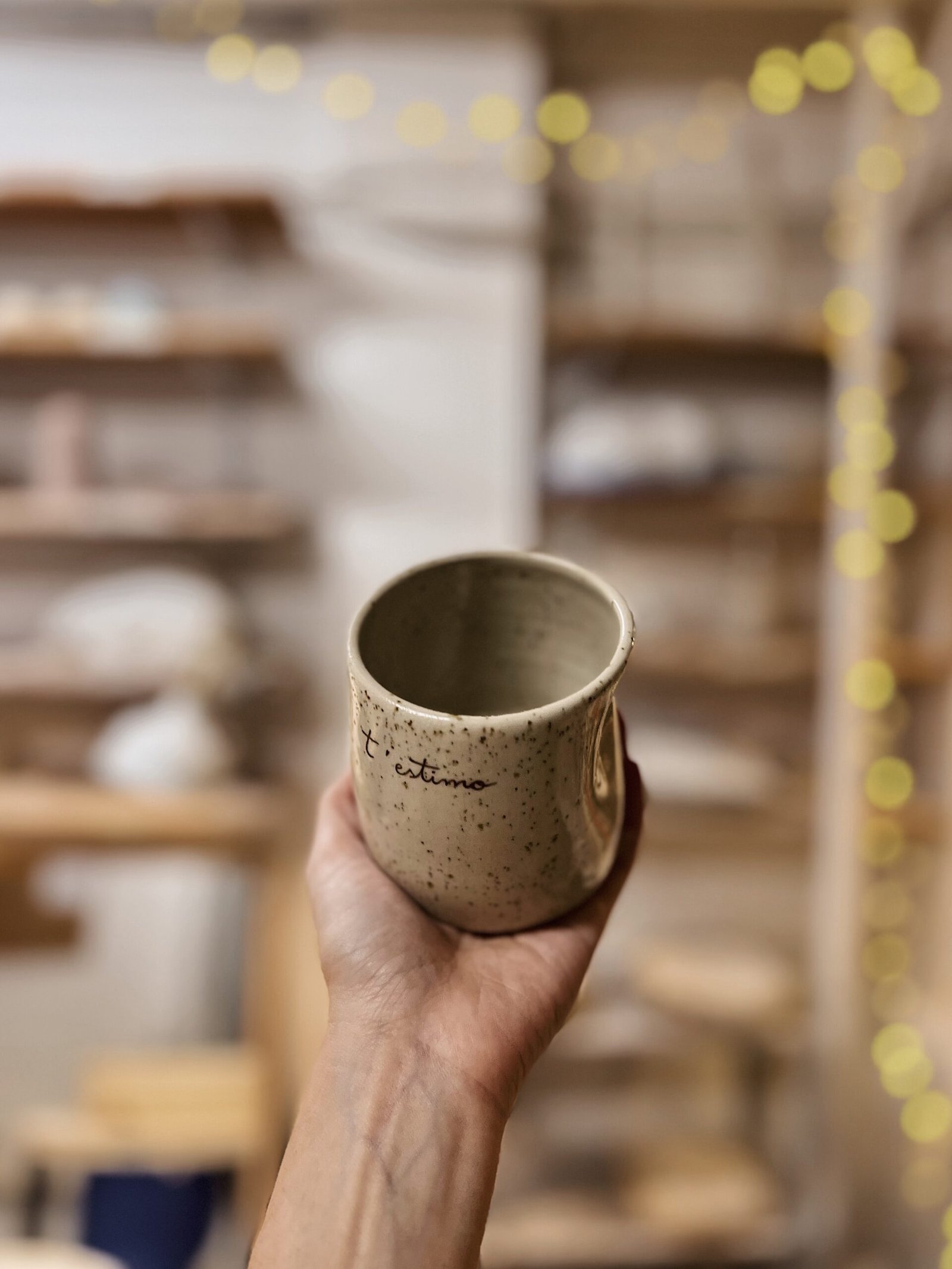 Este vaso está hecha con gres moteado de alta temperatura en torno alfarero, esmaltada en transparente con texto escrito a mano con engobe marrón. La forma de pellizco hace que sea un vaso ergonómico ya que se adapta perfectamente a tu mano